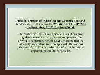 The document summarizes a conference about international public procurement projects handled by the World Bank. The conference aims to bring together procurement agencies and bidders to ensure bidders understand criteria and opportunities. It will discuss World Bank bidding guidelines and procedures, common problems in public procurement, and how to participate in multilateral funding agency projects. The conference provides a platform for both buyers and sellers to understand challenges and requirements in the public procurement process.