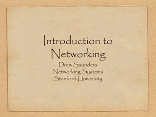 The document is an introductory overview of networking concepts at Stanford University. It covers the goals of the class, essential networking terminology, and details on networking protocol models, including OSI layers. It also explains basic components of networking such as physical and data layers, Ethernet addressing, and the role of routers in data communication.