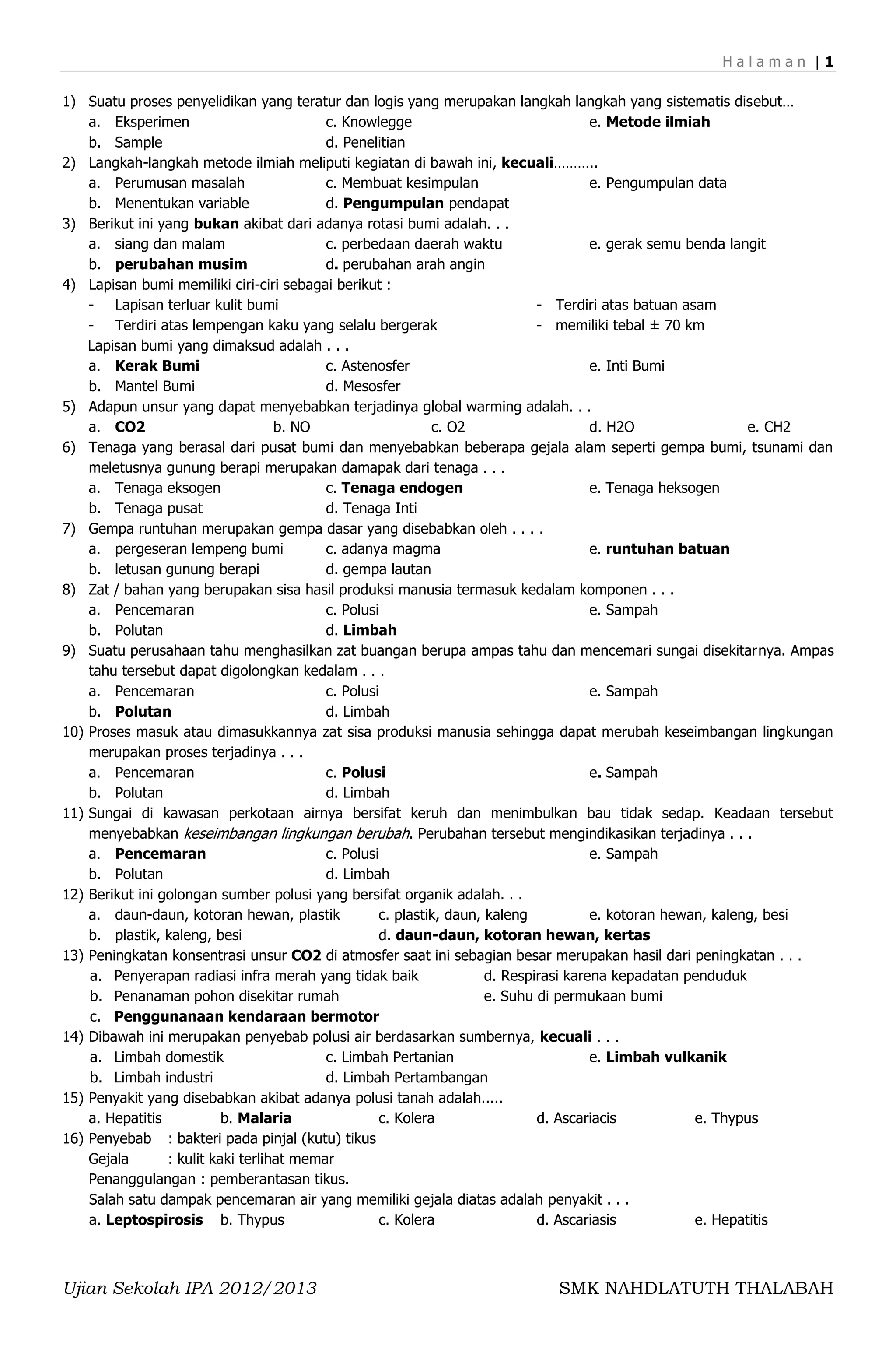 Teks tersebut berisi soal-soal ujian sekolah tentang IPA yang mencakup berbagai aspek ilmu pengetahuan seperti metode ilmiah, bumi, lingkungan hidup, ekologi. Beberapa poin penting yang tercakup adalah definisi metode ilmiah, komponen-komponen bumi, jenis-jenis polusi dan pencemaran lingkungan, hubungan antar makhluk hidup dan lingkungan dalam ekosistem.