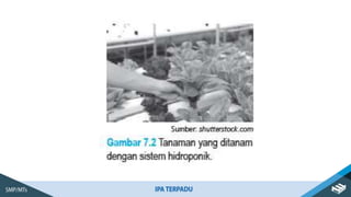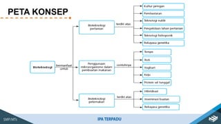 Dokumen tersebut membahas mengenai peran bioteknologi dalam meningkatkan produktivitas pangan. Bioteknologi digunakan untuk menghasilkan tanaman dan hewan unggul melalui teknik seperti kultur jaringan, pembastaran, rekayasa genetika, dan inseminasi buatan. Bioteknologi diharapkan dapat mengatasi masalah ketersediaan pangan akibat pertambahan populasi manusia.