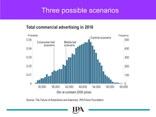The document discusses the future of advertising and agencies in a networked society. It outlines three possible scenarios for the future, including a worst case scenario where agency revenue declines by £16 billion. The document also discusses the rise of social media and how brands are integrating social platforms into their communications strategies. It analyzes consumer behavior on social media and how agencies may need to change to adapt to shifts in consumer control, responsibility, and expectations around advertising and data sharing over the next decade.