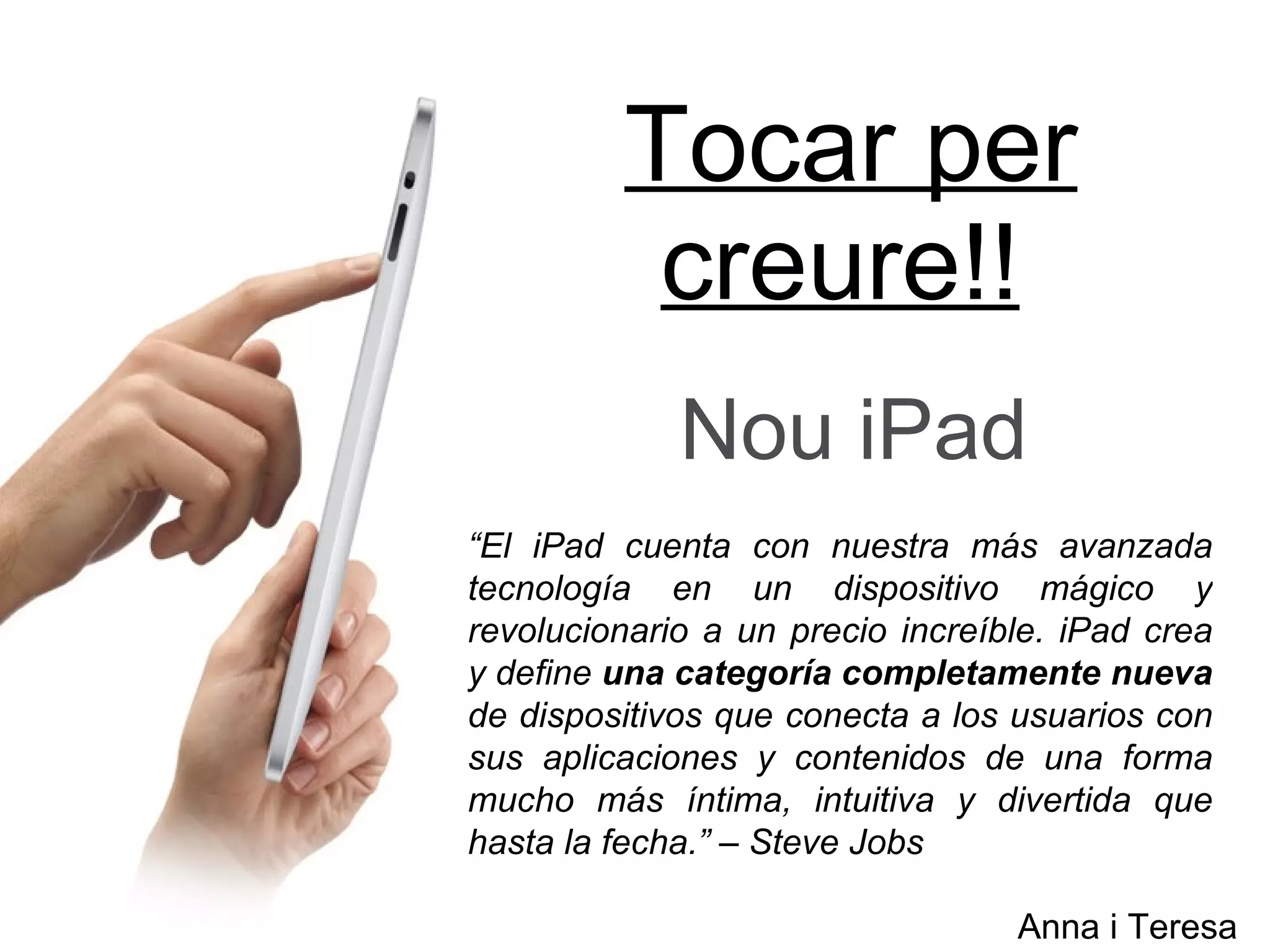Tocar per creure!!Nou iPad Anna i Teresa “ El iPad cuenta con nuestra más avanzada tecnología en un dispositivo mágico y revolucionario a un precio increíble. iPad crea y define una categoría completamente nueva de dispositivos que conecta a los usuarios con sus aplicaciones y contenidos de una forma mucho más íntima, intuitiva y divertida que hasta la fecha.” – Steve Jobs