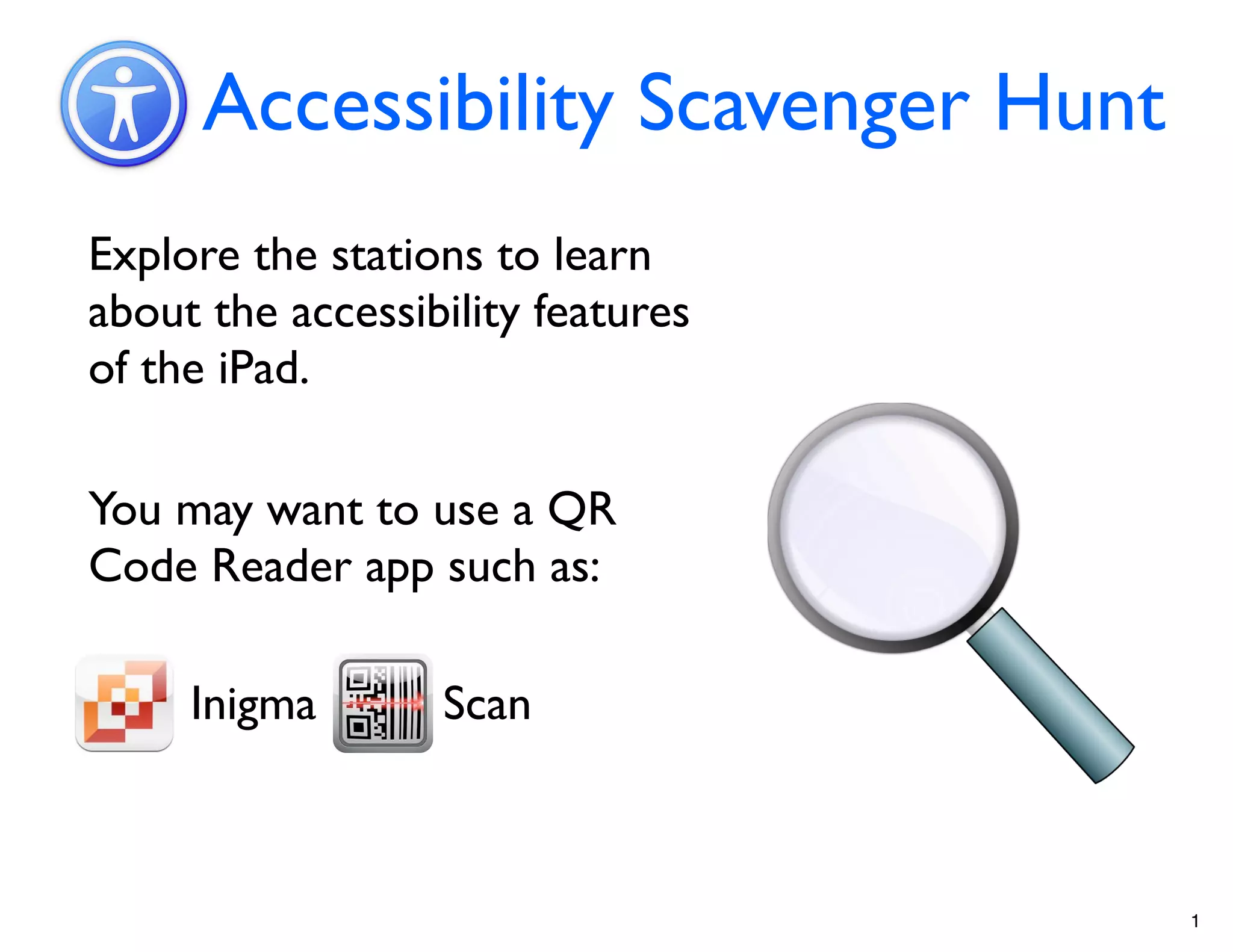 This document provides an accessibility scavenger hunt to explore features on the iPad that can help users with disabilities. It highlights text-to-speech, voice control, screen magnification, color inversion, and other tools available in the Accessibility settings. Scanning QR codes leads to videos demonstrating features like VoiceOver that reads everything on screen and guided access to focus on one app.