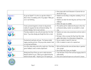 This document provides a summary of popular apps that can be used in a one iPad classroom setting. It lists over 20 apps including Animoto, Common Core Standards from Mastery Connect, Educreations, Evernote, Flashcards+, Flipboard, Google Drive, iBooks, Lino, Nearpod, Poll Everywhere, Quizlet, Socrative, SoundCloud, Stage, Timer Plus, and options for mirroring the iPad screen such as Air Server, Reflector, and Apple TV. For each app, it provides a brief description of its functionality and tips for how teachers can integrate the app into classroom lessons and activities.