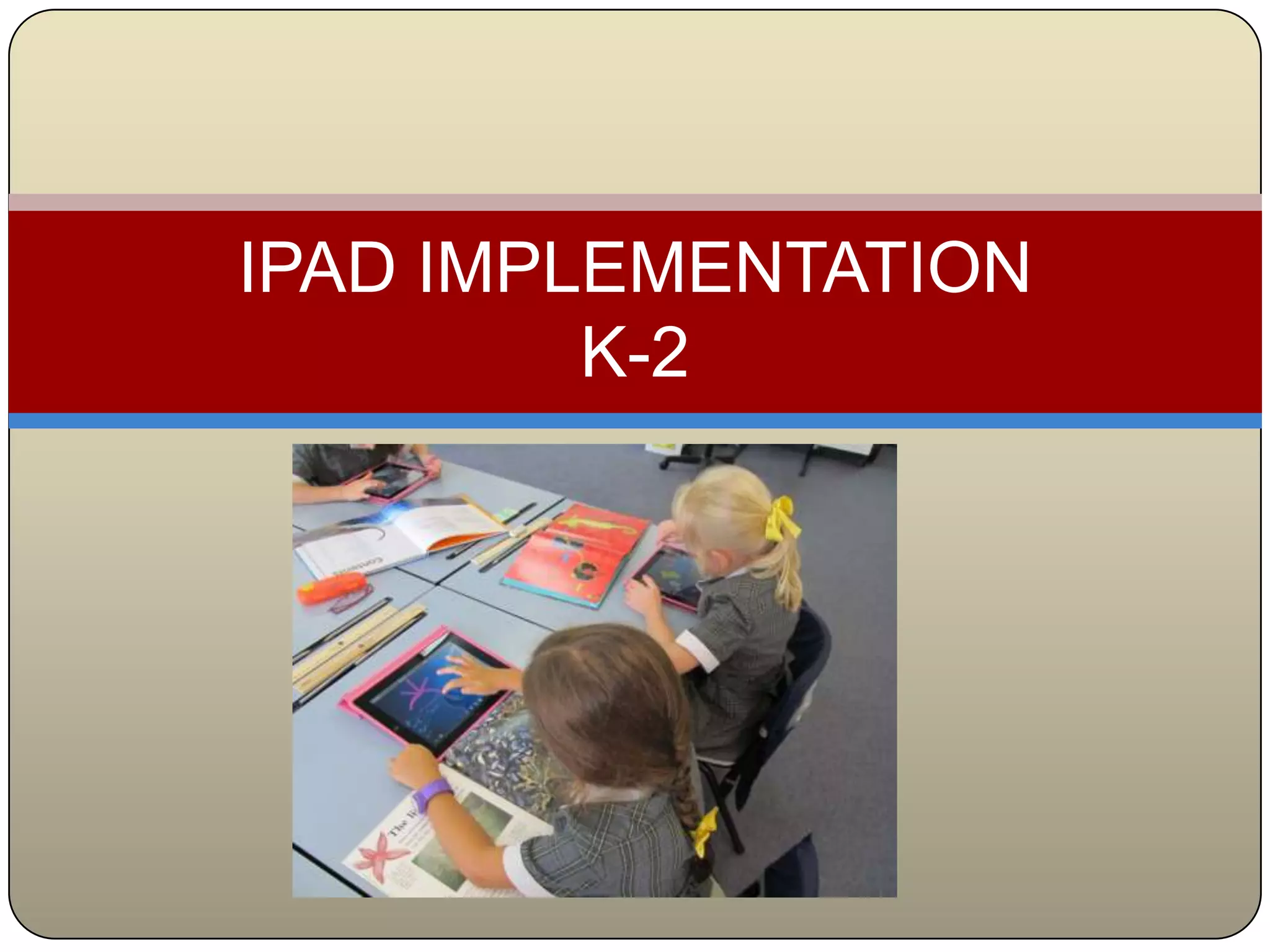 This document discusses strategies for implementing iPads in K-2 classrooms. It recommends starting with a 1:2 student to iPad ratio and providing teachers their own iPads and professional learning opportunities. Focusing on creation apps rather than just content apps can help students apply their learning. It also stresses the importance of developing an app request process, budgeting, staff training and support, adequate testing time, cyber safety programs, and maintaining a team effort for successful iPad implementation.
