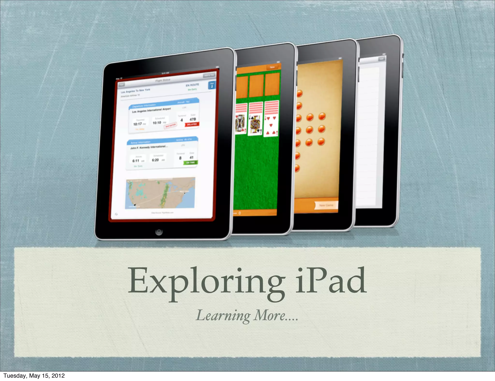 This document provides tips and explanations for exploring and customizing the iPad. It discusses 1) organizing apps into folders, 2) using app icons, 3) the spotlight search tool, 4) page indicators, and 5) placing frequently used apps in the dock. It also explains how to edit the home screen, view purchased apps, optimize battery life, use split and full keyboards, enable assistive touch and multitasking gestures, use AirPlay to stream content, and create a custom lock screen image.