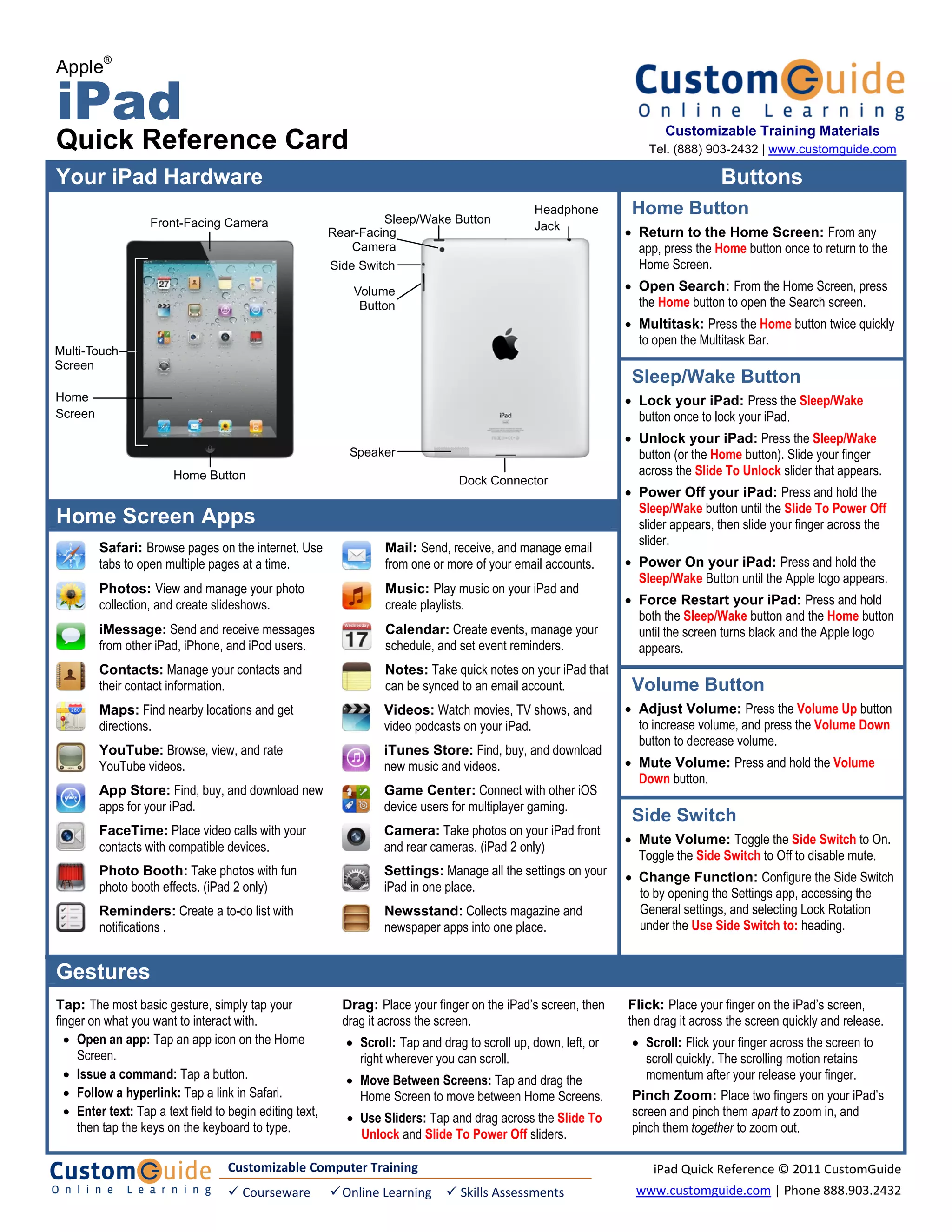 This document provides a quick reference to the hardware buttons and gestures used to operate an Apple iPad. It summarizes the primary functions of the Home button, Sleep/Wake button, Volume button, Side Switch, as well as gestures like tap, drag, flick and pinch to zoom. The summary also outlines how to access and use common apps from the Home screen like Safari, Photos, Mail and more. It describes how to connect to Wi-Fi and cellular networks, copy and paste text, and customize settings.