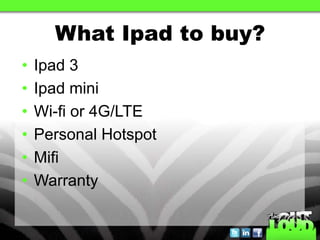 This document provides information and recommendations for setting up and using an iPad, including which iPad and data plan to purchase based on budget and intended use. It discusses key iPad equipment, how to set up accounts and sync with iTunes, configure mail and other settings. The document also recommends foundational apps for tasks like backing up data, accessing files on a computer, and signing documents electronically. It concludes with a Q&A section and links for further information.