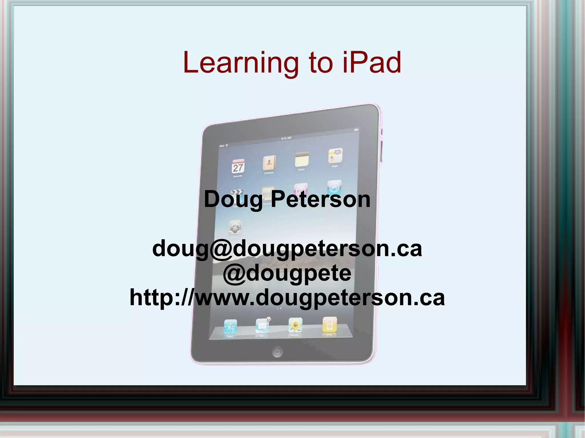 1. The document provides tips and instructions for setting up and configuring an iPad, including how to turn it on, connect to WiFi, and adjust settings like notifications, location services, and security.