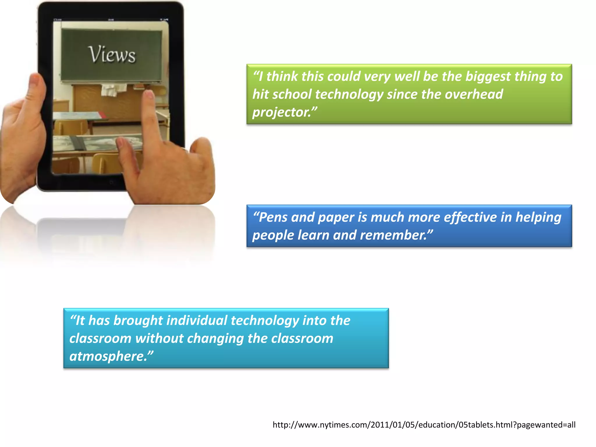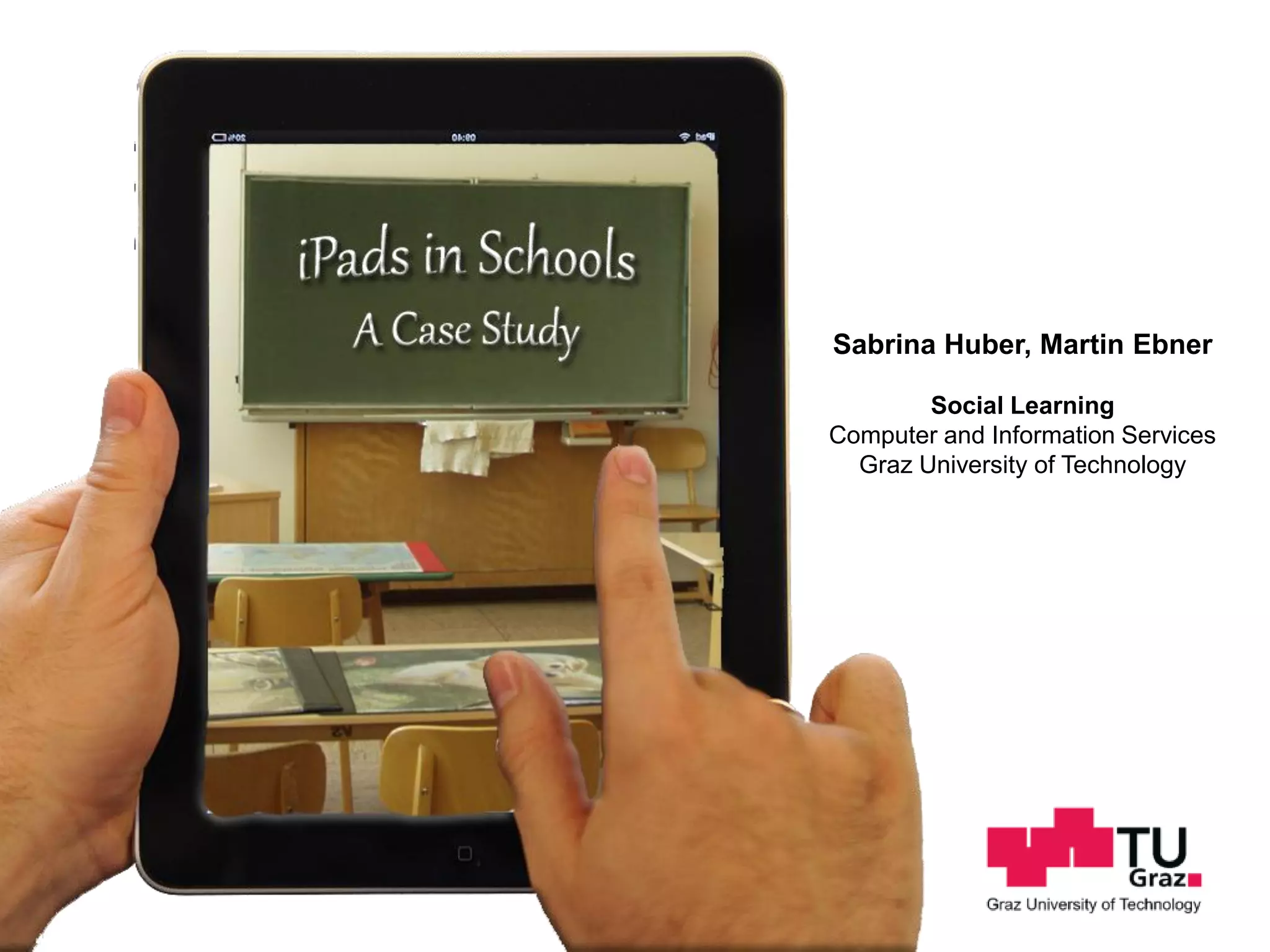 This document summarizes a study on using iPads in a 4th grade classroom in Austria. [1] It found that iPads increased student motivation and willingness to help each other. [2] Well-designed educational apps were useful, and students enjoyed the variety of apps. [3] However, issues included WiFi instability, distraction from overhearing teachers, envy among students, and apps not being designed for long-term use.