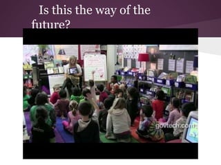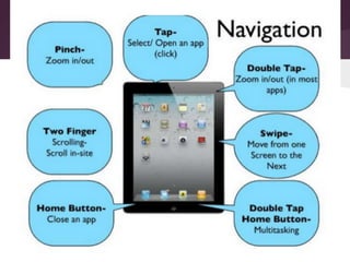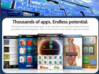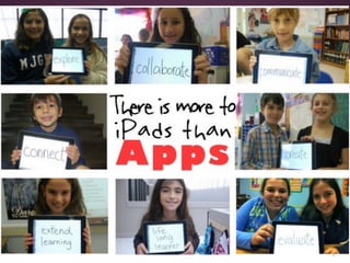 This document discusses using iPads in elementary classrooms to promote 21st century teaching and learning. It outlines goals of increasing student engagement, literacy skills, and facilitating learning through creativity, critical thinking, collaboration and communication. It then provides examples of literacy and math apps, as well as apps for social studies, art, reading, writing, and content management. It discusses using iPads to create tutorials, movies, comics and more. Finally, it discusses resources for finding iPad apps and evaluating them for classroom use.