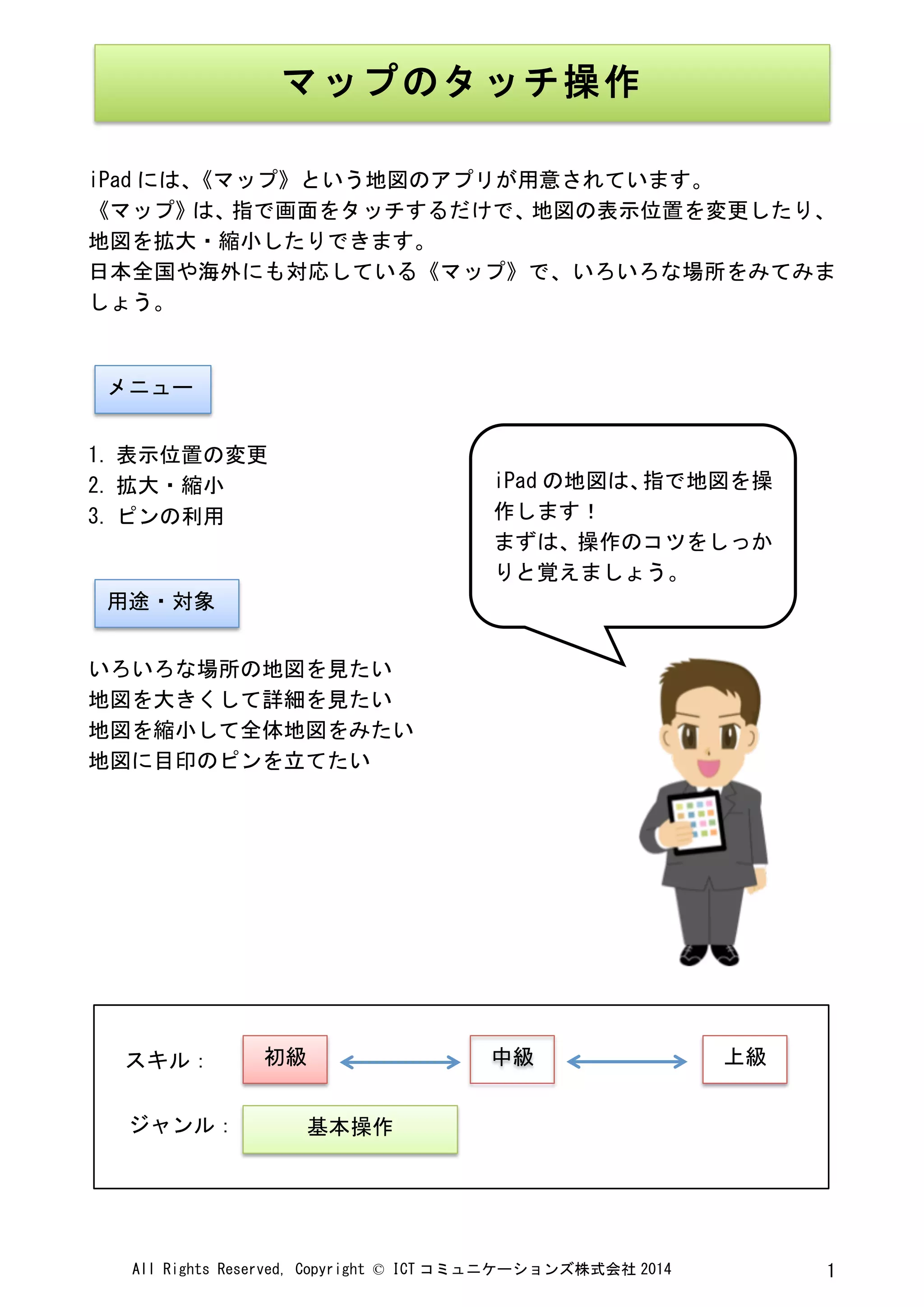 Copyright © ICT コミュニケーションズ株式会社 2014 1 iPad には、《マップ》という地図のアプリが用意されています。 《マップ》は、指で画面をタッチするだけで、地図の表示位置を変更したり、 地図を拡大・縮小したりできます。 日本全国や海外にも対応している《マップ》で、いろいろな場所をみてみま しょう。 1. 表示位置の変更 2. 拡大・縮小 3. ピンの利用 いろいろな場所の地図を見たい 地図を大きくして詳細を見たい 地図を縮小して全体地図をみたい 地図に目印のピンを立てたい マップのタッチ操作 メニュー 用途・対象 iPad の地図は、指で地図を操 作します! まずは、操作のコツをしっか りと覚えましょう。 初級 中級 上級 基本操作 スキル: ジャンル: