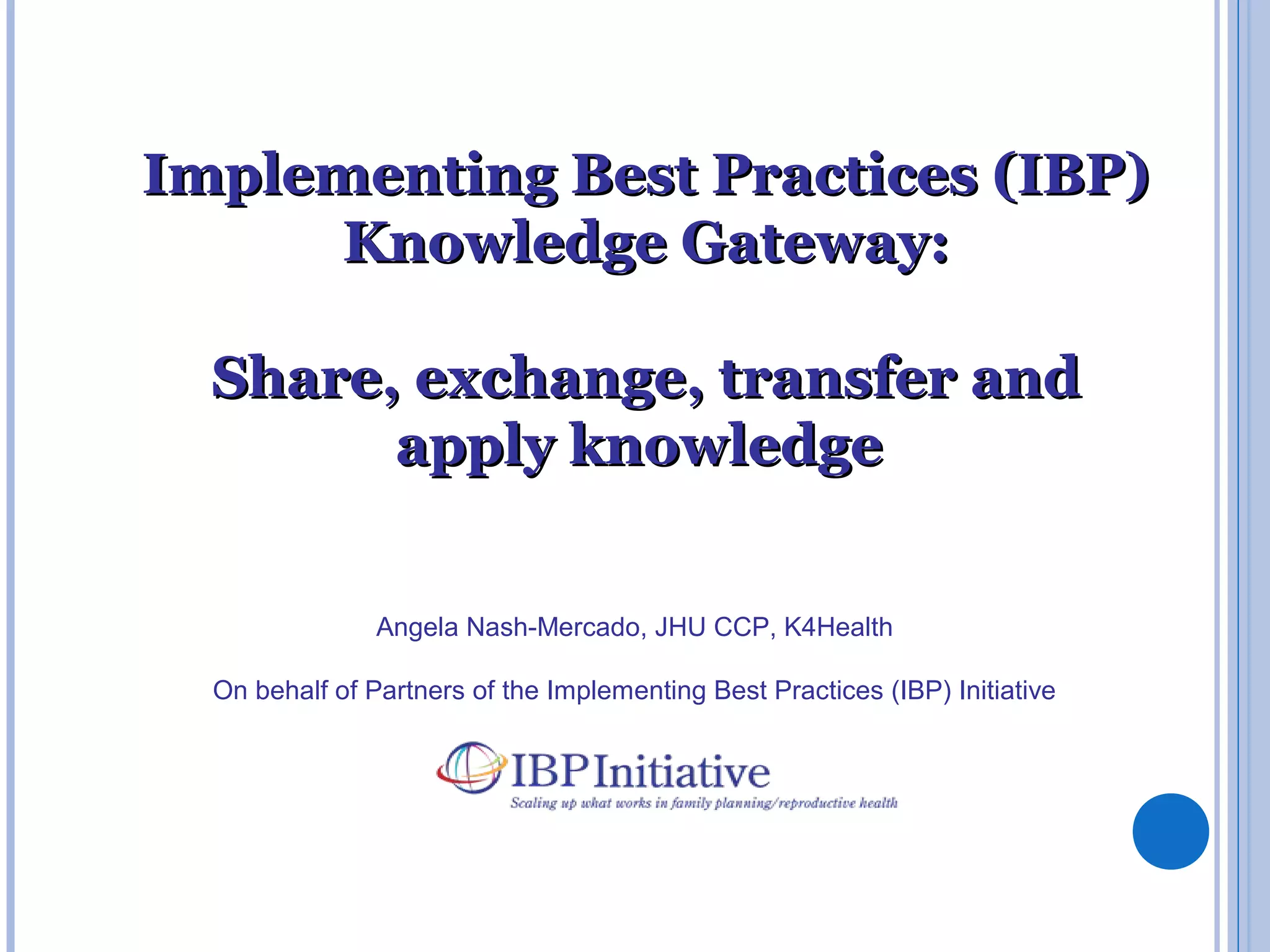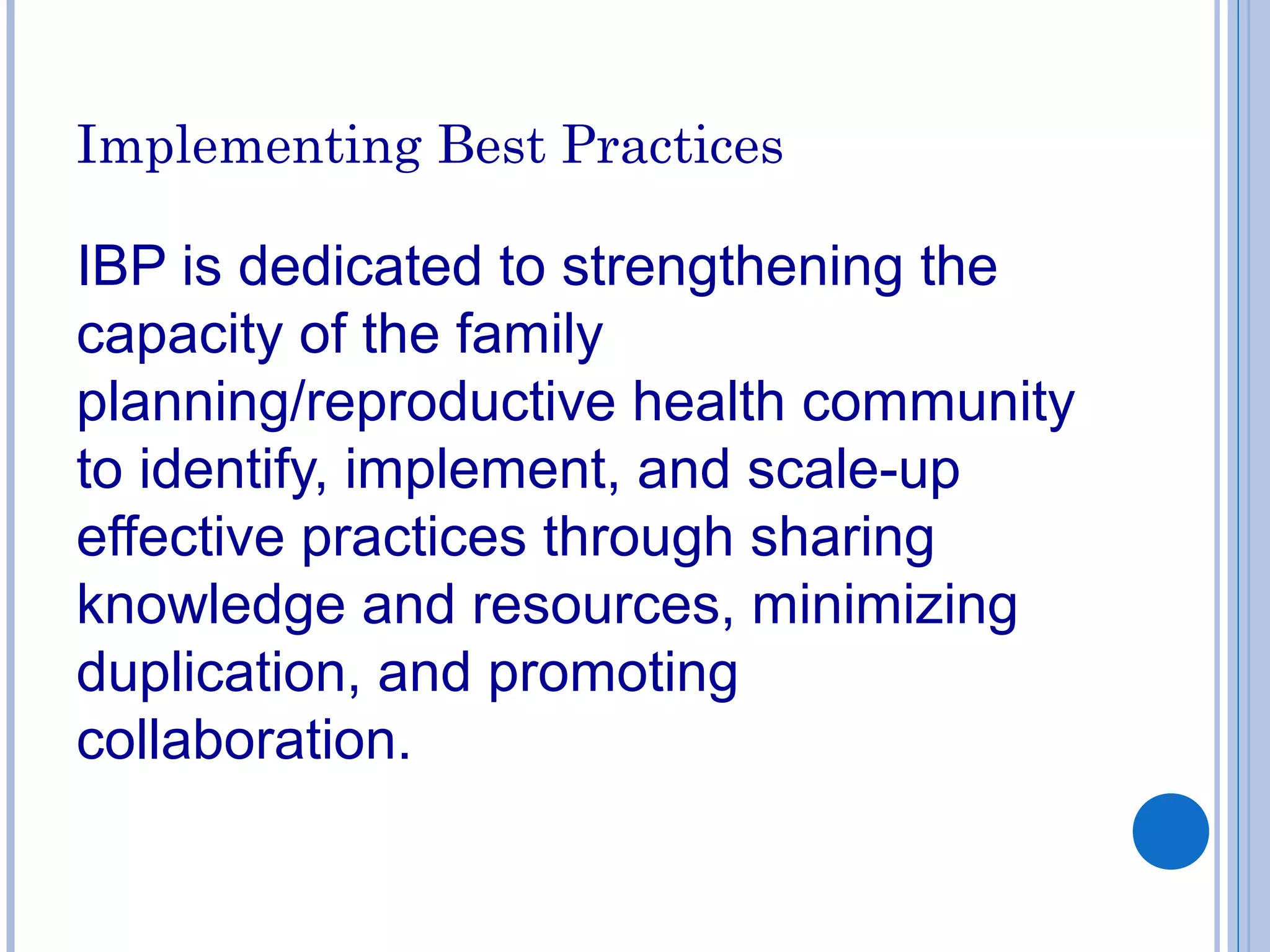 The Implementing Best Practices (IBP) initiative aims to strengthen family planning and reproductive health programs by sharing knowledge and resources between its diverse member organizations. IBP and its consortium members, which include WHO, USAID, and other global health organizations, work at global, regional, and country levels to identify and spread effective practices. They utilize the Knowledge Gateway, a web-based platform, to facilitate exchange of expertise between practitioners and enable collaboration. The goal is to improve health programs by overcoming knowledge gaps and unlocking experience from various organizations.