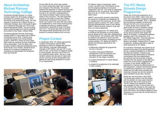 The IPC Media Schools Design Programme was a two-phase pilot programme run by Archbishop Michael Ramsey Technology College and IPC Media. Phase one involved 12 after-school design sessions using InDesign software followed by a week of work experience at IPC Media magazines. Evaluations informed improvements for phase two, including more integrated curriculum lessons and intensive two-week design courses. Students gained technical design skills and real work experience, and many were inspired to pursue design careers. The partnership successfully addressed career awareness and curriculum integration goals.