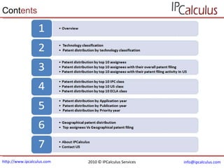 This document discusses patenting activity related to Internet Protocol Television (IPTV). It notes that the number of global IPTV subscribers is expected to grow significantly between 2009 and 2013. The top assignees for IPTV patents are AT&T Corp, Microsoft Corp, Ericsson Inc, Alcatel Lucent, and Samsung Electronics Co Ltd. The document also provides breakdowns of IPTV patents by technology, assignee, location, and other categories.