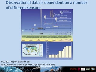 The document discusses key aspects of the 2013 IPCC report, including that climate models are based on the main drivers of climate change, observational data depends on different sensors, and grid-scale resolution is important for improved climate models. It also describes four emission scenarios (RCP8.5, RCP6, RCP4.5, and RCP2.6) that climate models incorporate to project a range of possible climate futures based on different levels of emissions.