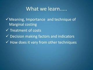 Marginal costing is a technique that separates total costs into fixed and variable costs. It helps management make decisions by calculating indicators like profit volume ratio, break-even point, margin of safety, and indifference point. The document provides an example problem demonstrating how to use marginal costing to calculate these indicators and make decisions. It explains key concepts like contribution, variable costs, fixed costs, and how marginal costing varies from other costing techniques.