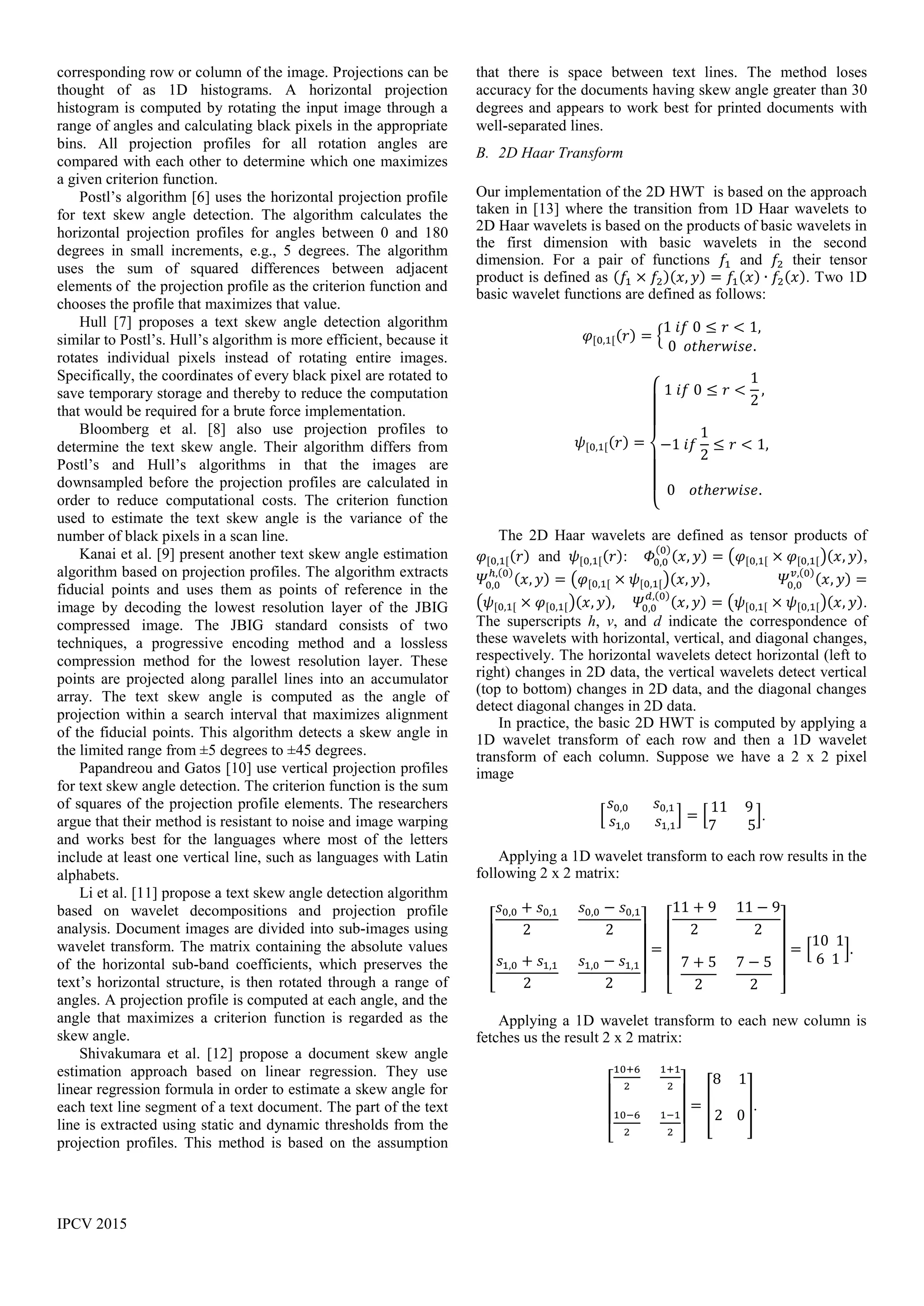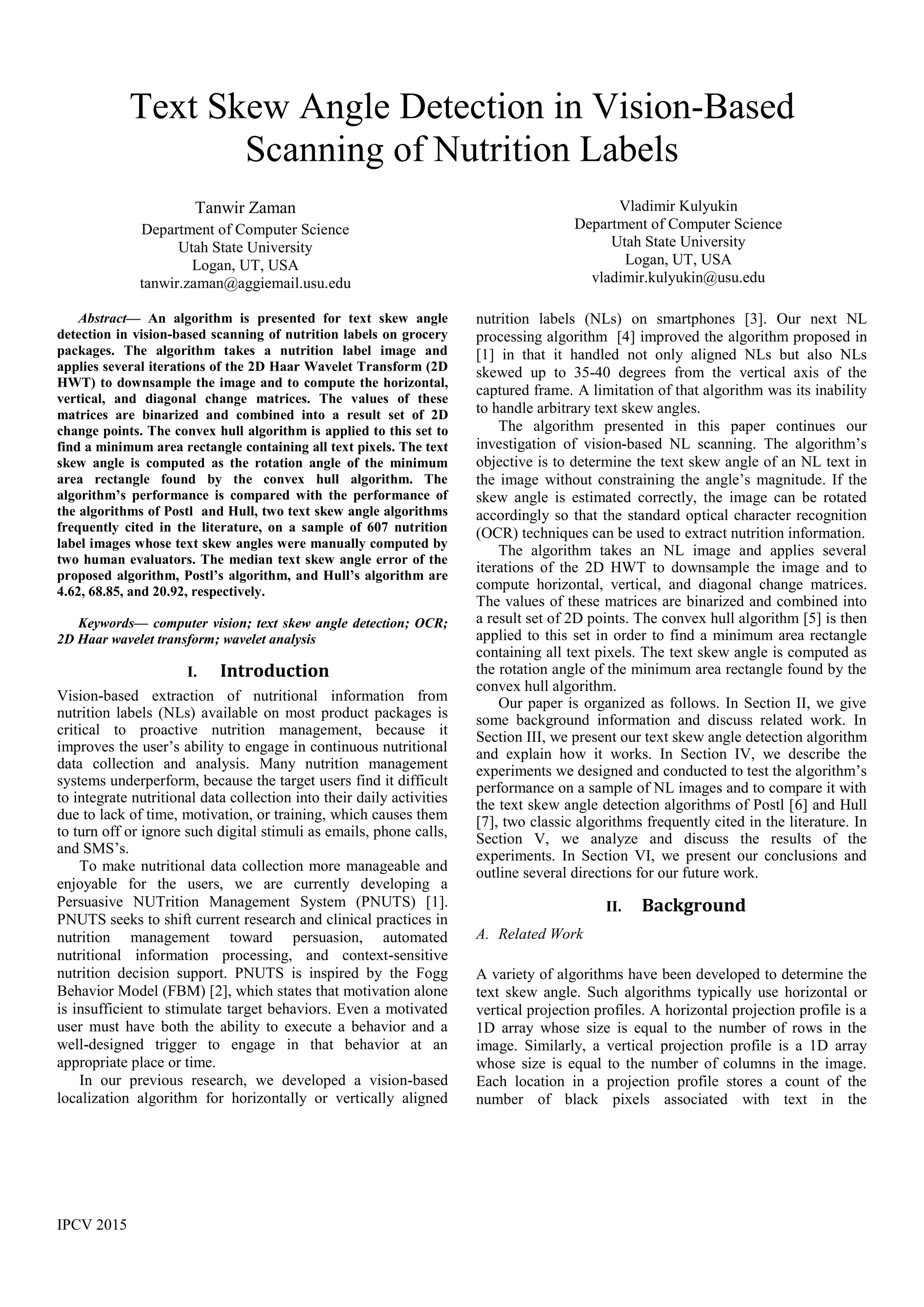 This document presents an algorithm for detecting the text skew angle in images of nutrition labels. The algorithm applies multiple iterations of the 2D Haar Wavelet Transform to downsample the image and compute horizontal, vertical, and diagonal change matrices. It then binarizes and combines these matrices into a set of 2D change points. Finally, it uses a convex hull algorithm to find the minimum area rectangle containing all text pixels, and calculates the text skew angle as the rotation angle of this rectangle. The algorithm's performance is compared to two other text skew detection algorithms on a sample of over 600 nutrition label images, finding a median error of 4.62 degrees compared to 68.85 and 20.92 degrees for the other algorithms.