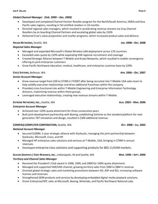 Ian P. Dillon is a senior account executive with over 25 years of experience in strategic sales and business development. He has a proven track record of exceeding sales quotas and closing major deals, such as a $100M strategic partnership between Starbucks and HP. Currently, he is developing and leading high performance computing sales opportunities at Dell to maximize revenue. Previously, he held sales leadership roles at various technology companies where he established key partnerships, grew sales territories significantly, and delivered tactical solutions to customers.
