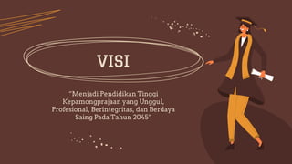 Dokumen tersebut merangkum visi, misi, sejarah, program studi, dan fasilitas Institut Pemerintahan Dalam Negeri (IPDN). IPDN bertekad menjadi lembaga pendidikan pemerintahan yang unggul, profesional, dan berdaya saing pada tahun 2045 melalui pengembangan ilmu pemerintahan, pendidikan yang sesuai kebutuhan, serta penelitian dan pengabdian untuk masyarakat. IPDN didirikan pada tahun 1956 dan saat ini