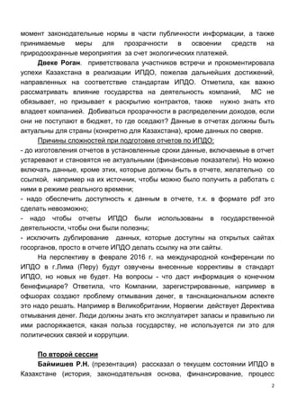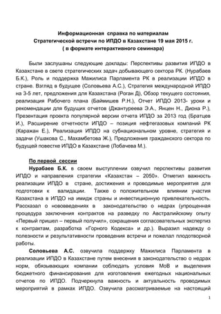 На стратегической встрече по ИПДО в Казахстане 19 мая 2015 года были обсуждены перспективы развития ИПДО, законодательные инициативы и необходимость повышения прозрачности в отчетности. Участники акцентировали внимание на важности соблюдения условий МОВ и улучшении доступности информации, а также необходимости создания региональных многосторонних групп для повышения осведомленности населения. В результате встречи были даны рекомендации по усовершенствованию отчетности и активизации корпоративно-социальной ответственности компаний.