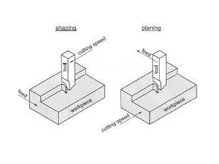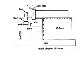 This document provides information about a shaper machine tool. It includes specifications of a shaper such as maximum ram stroke length and power input. It then describes the main parts of a shaper like the base, column, ram, and tool head. Different types of shapers are classified based on ram travel direction, cutting stroke action, and driving mechanism. Common shaping operations like machining horizontal and vertical surfaces are outlined. Formulas for cutting time and quick return ratio are also provided.