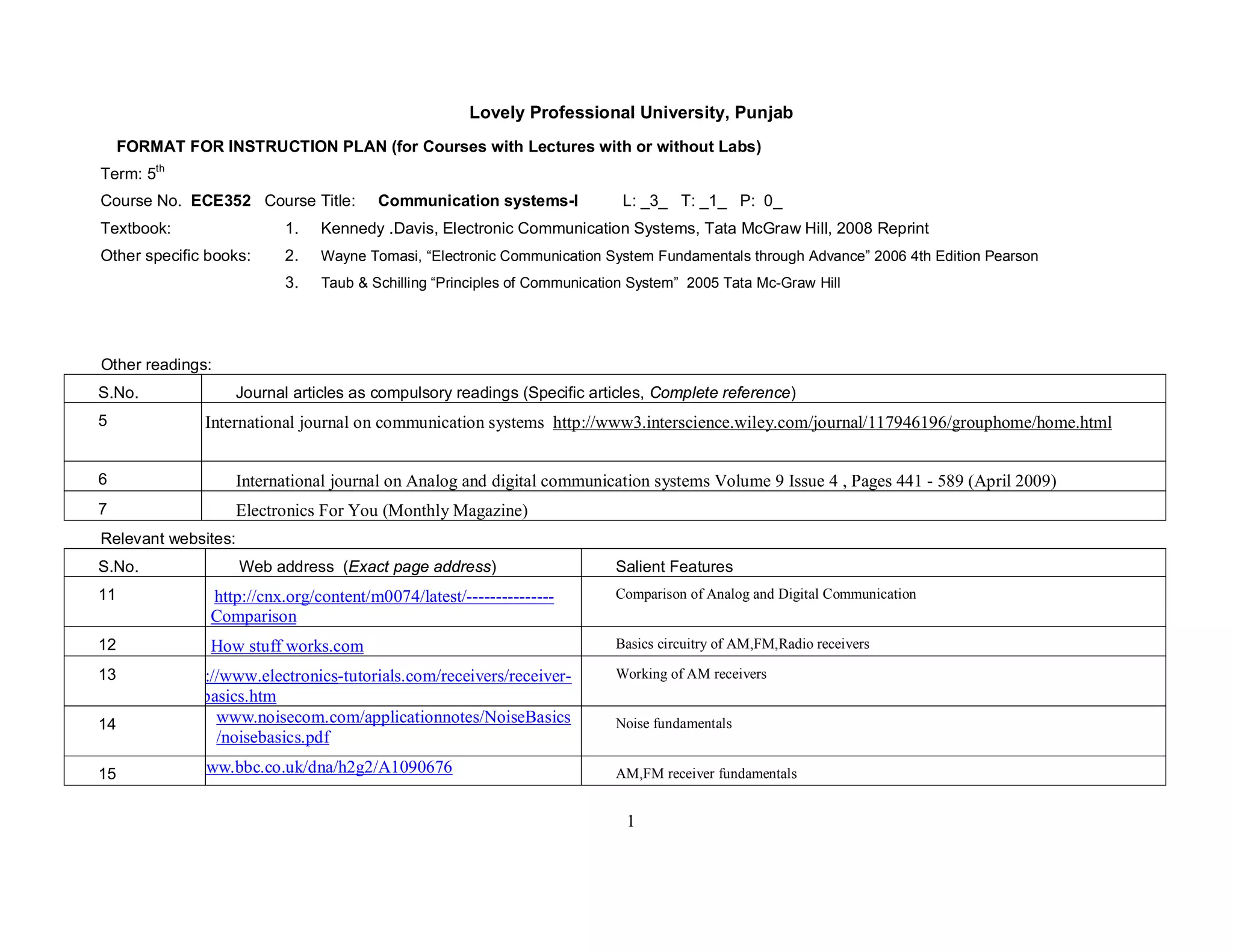The document provides an instruction plan for the course "Communication Systems-I" with lectures and labs.