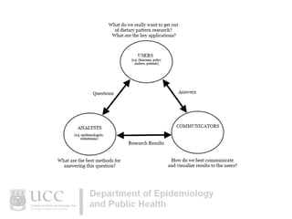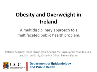 This document summarizes an interdisciplinary research project on obesity in Ireland. The project uses a lifecourse approach, drawing on data from multiple Irish cohort and cross-sectional studies spanning different age groups. The aims are to describe risk factors for obesity, cardiovascular disease, and diabetes over the lifecourse and relate these to health outcomes. The research team includes investigators from the various studies as well as experts in biostatistics, epidemiology, health services, nutrition, and clinical areas. Work packages will investigate health service utilization across the lifecourse, statistical methods for accelerometer data, and relationships between diet, physical activity, and non-communicable disease risk.