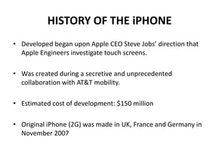 The document presents information about the history and features of the iPhone. It discusses how the iPhone was developed under Steve Jobs' direction to investigate touch screens. Over $150 million was spent developing the first iPhone, which was released in 2007 and sold over 33 million units that year. The document then outlines the key features of the iPhone, including its high resolution retina display, long battery life, vast app selection, advanced iOS operating system, intelligent Siri assistant, iCloud integration, and high customer satisfaction ratings.