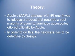 The document analyzes Apple's strategy with the iPhone 4 reception issues and profiting from accessory sales. It argues that Apple intentionally designed a hardware defect to force users to buy protective bumpers. The bumpers cover the exposed antenna area that causes reception issues when holding the phone a certain way. Apple is estimated to make $25.90 profit per bumper sold versus less profit from iPhone 4 hardware sales alone. The document concludes Apple stands to make three times more from accessory sales through this forced market strategy.