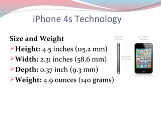 The document summarizes key features and specifications of the iPhone 4s. It describes the phone's size, display, processor, camera, battery life, iOS operating system, Siri voice assistant, iCloud storage, app development capabilities, and popular apps. The iPhone 4s has an 8 megapixel camera, dual-core A5 chip, voice control with Siri, and 1080p HD video recording. It also has iCloud online storage and supports a wide range of apps across various categories.