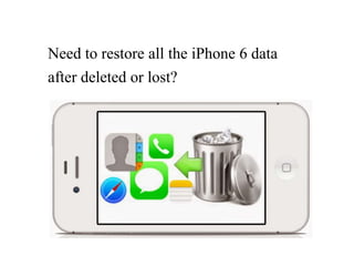 The document provides a complete guide for recovering deleted or lost data from iPhone 6 and iPhone 6 Plus, detailing three methods: no backup, iTunes backup, and iCloud backup. It introduces Tenorshare's iPhone 6 Data Recovery program, the first of its kind, capable of recovering 16 types of data. The recovery methods include direct retrieval from the device, restoring from an iTunes backup, and restoring from an iCloud backup.