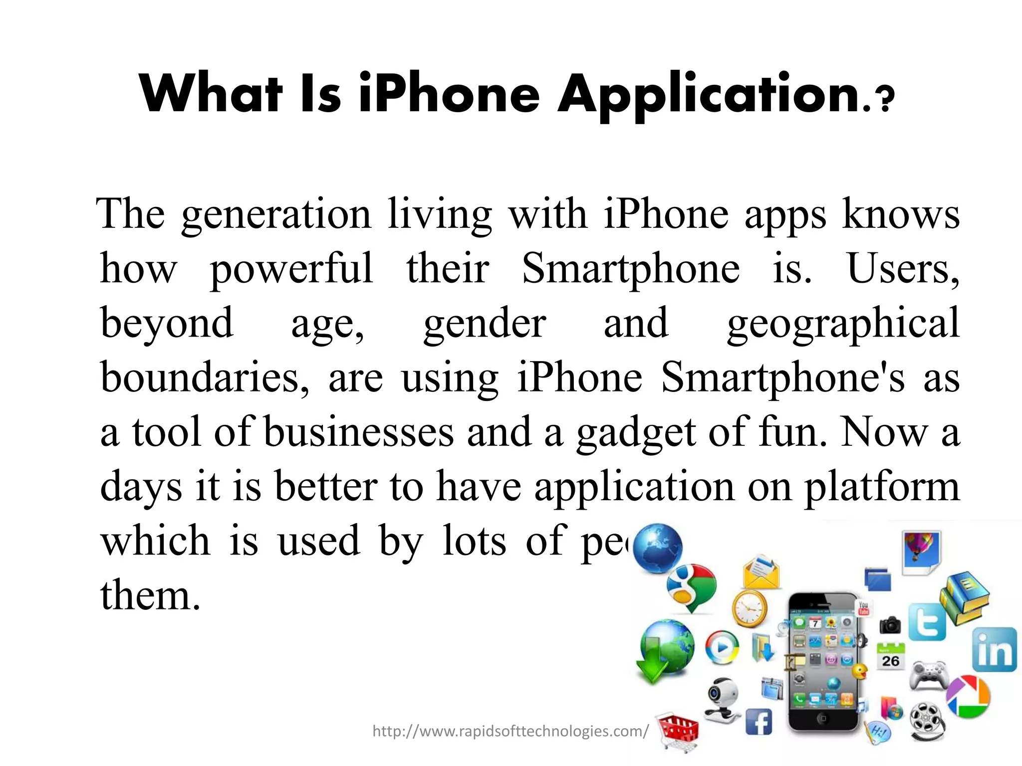 The document discusses the significance of iPhone applications, emphasizing their widespread use across demographics for both business and entertainment. It highlights key factors influencing app development costs and essential considerations during the process, such as the need for experienced developers and thorough testing. Rapidsoft Technologies is presented as a specialized company with extensive experience in designing and developing iPhone applications since the App Store's launch in 2008.
