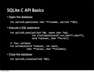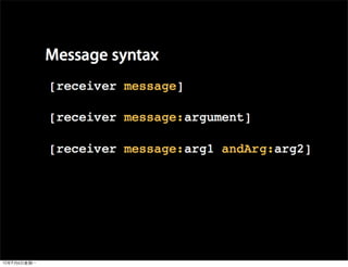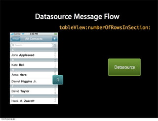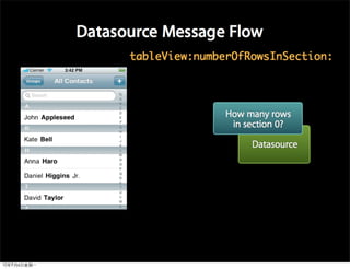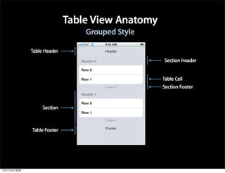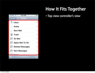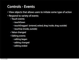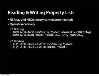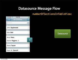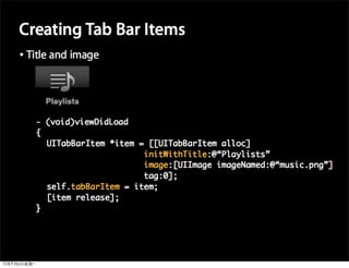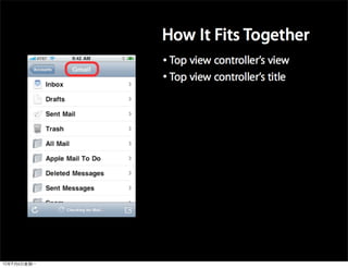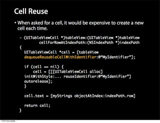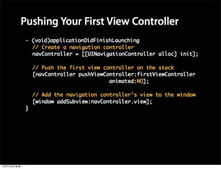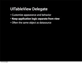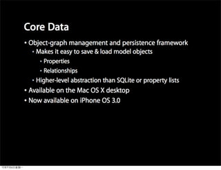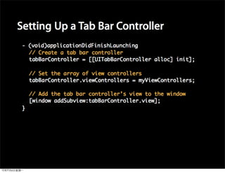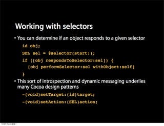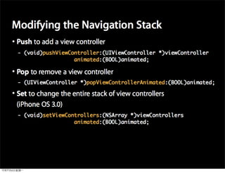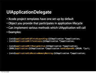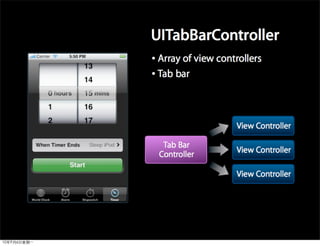 This document provides an overview of developing applications for the iPhone using Objective-C and the UIKit framework. It discusses Objective-C concepts like classes, memory management, categories and protocols. It also covers the iPhone UIKit including views, navigation controllers, tab bar controllers and table views. Other topics include data storage options like property lists, SQLite and web services. Sample code is provided to demonstrate various Objective-C and iPhone programming concepts.