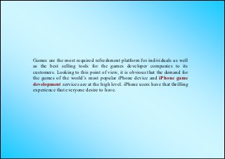 Our iPhone games development is professional and enhanced service as we have best knowledge of iPhone SDK development that we are using in developing different iPhone games to the game lovers as well as companies engaged in game industry across the world.