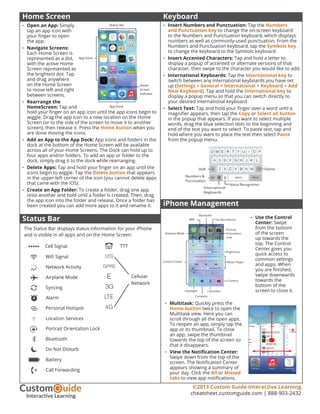 The document is a quick reference guide detailing the main features and functionalities of the Apple iPhone, including hardware buttons, gestures, and built-in apps. It provides instructions on actions such as locking/unlocking the device, managing apps, and using the control center. Additional information covers text manipulation features and the status bar indicators for various functions.