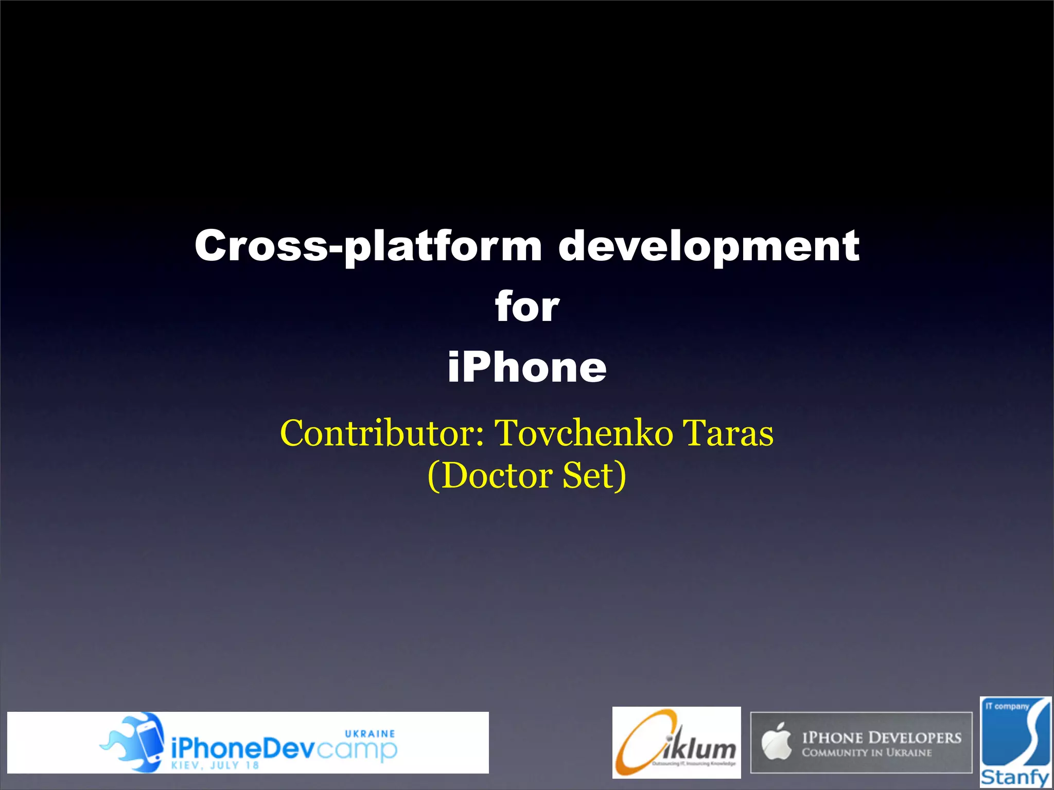 This document discusses cross-platform development for the iPhone. It outlines two main approaches: porting existing code and writing new code designed for cross-platform use. Porting involves overcoming challenges like incompatible languages and system APIs across platforms. Solutions proposed include runtime libraries like qobjc and frameworks like dCocoa that emulate Objective-C and provide portable APIs. Writing new code allows using languages and libraries like C++, Lua and Qt that are inherently cross-platform. The document provides examples of porting Objective-C code to dCocoa and discusses benefits of a cross-platform approach.