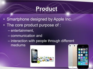 The document outlines the marketing mix strategy for the Apple iPhone 5s, detailing its core, actual, and augmented products that focus on entertainment, communication, and interaction. It describes the distribution channel, aggressive promotion tactics, target market, and pricing strategy, emphasizing a premium approach for new models. Additionally, it reflects on personal strengths and weaknesses in the context of developing innovative features for future iPhone versions.