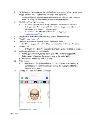 This document provides a comprehensive guide with tips for everyday iPhone users, focusing on features available in iOS 12. It covers various functionalities such as accessing the control center, using Siri, managing photos with iCloud, and utilizing accessibility features. Additionally, it includes instructions for finding apps, updating them, managing notifications, and sharing content through the Apple Wallet and iCloud services.