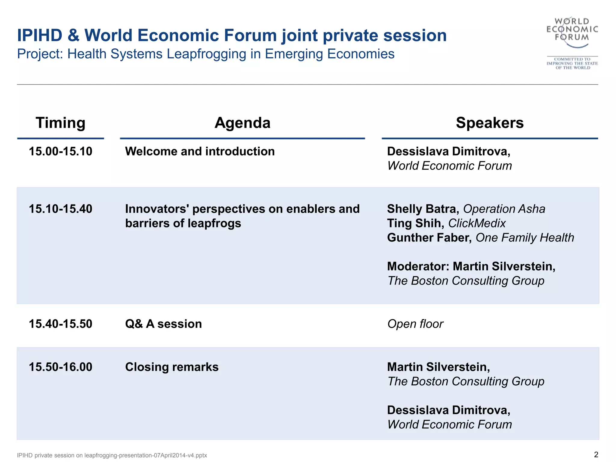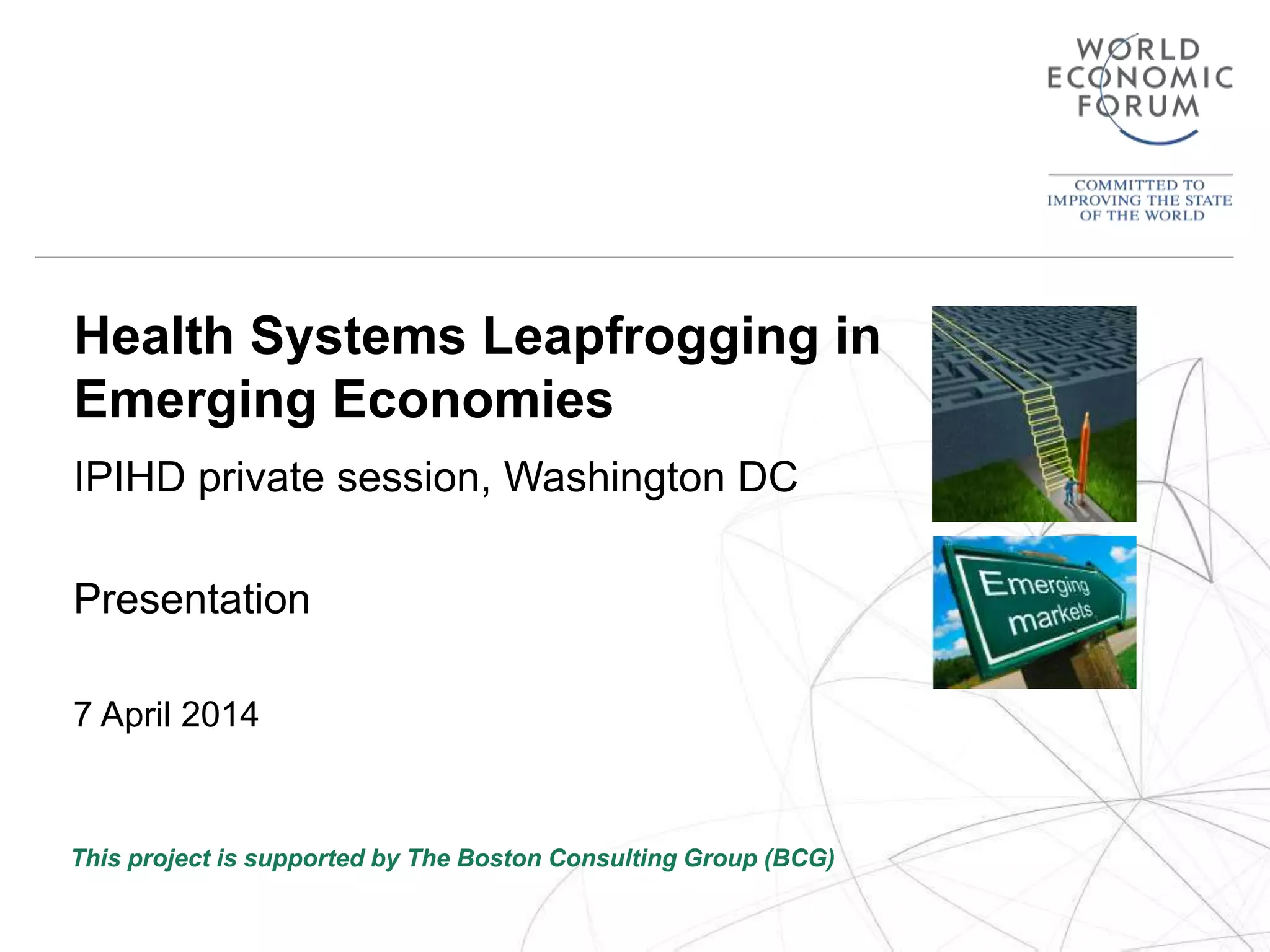 The document presents a session on health systems leapfrogging in emerging economies, discussing insights from innovators on barriers and enablers through a structured leapfrogging matrix. It categorizes health system elements such as prevention, service delivery, and financing, highlighting examples of successful innovations like telemedicine and mobile health initiatives. The session emphasizes the need for holistic health promotion and effective governance to enhance healthcare access and quality in low-income populations.