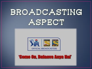 The document discusses the Indian Premier League (IPL), a professional Twenty20 cricket league in India. It summarizes that the IPL has been hugely successful commercially, with a brand value estimated at $3.03 billion in 2013. It attracts massive television viewership both within India and globally through broadcast syndication deals. The league provides new marketing opportunities for brands to partner with teams and players and connect with cricket's huge fan base in India.