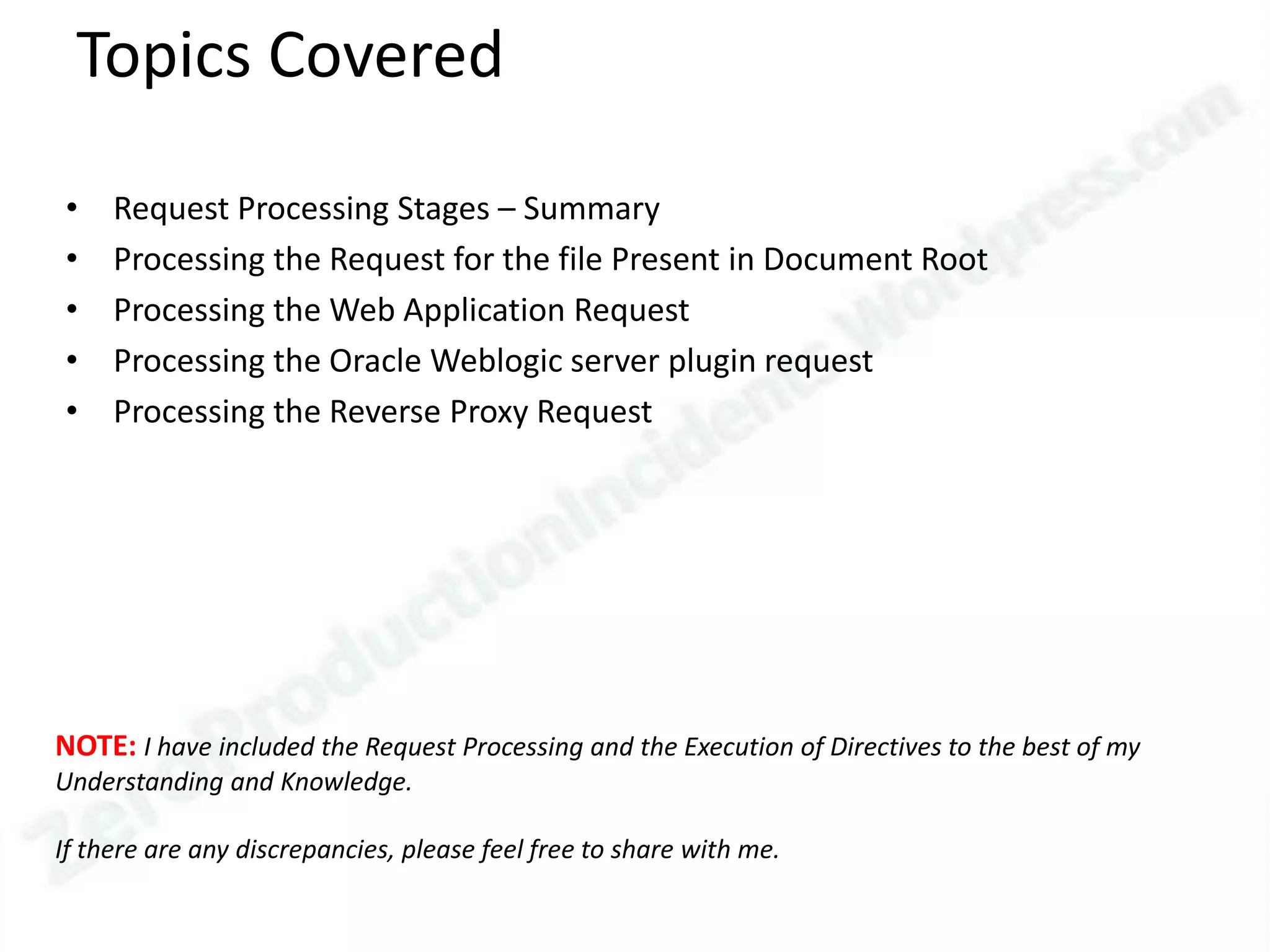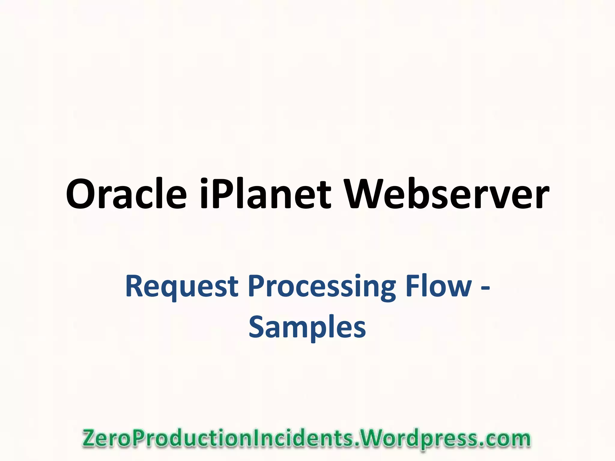The document summarizes the request processing flow for Oracle iPlanet Webserver. It describes the various processing stages including authentication, name translation, path checking, object typing, input/output processing, routing, service execution, error handling, and logging. Key directives are executed at each stage to determine how the request is handled. Requests for files in the document root and for web applications are processed differently, with different directives matched at each stage.