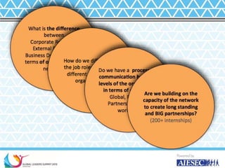 2. The BD Summit output included clarifying roles and responsibilities, collaboration for existing and new global partners, and creating a proposed structure for partnerships.
