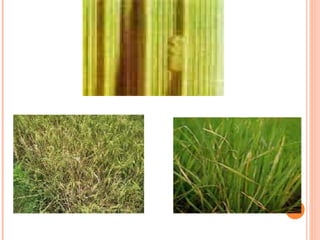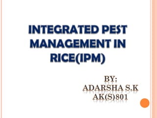 This document provides information on various pests that affect rice crops, including their names, descriptions of damage symptoms, and recommendations for management. It discusses pests such as rice thrips, rice grasshopper, rice gundhi bug, armyworm, rice caseworm, rice hispa, rice leaf folder, brown plant hopper, green plant hopper, white backed plant hopper, rice stem borer, and Asian gall midge. For each pest, it provides details on cultural, biological and chemical control methods that can be used for management.