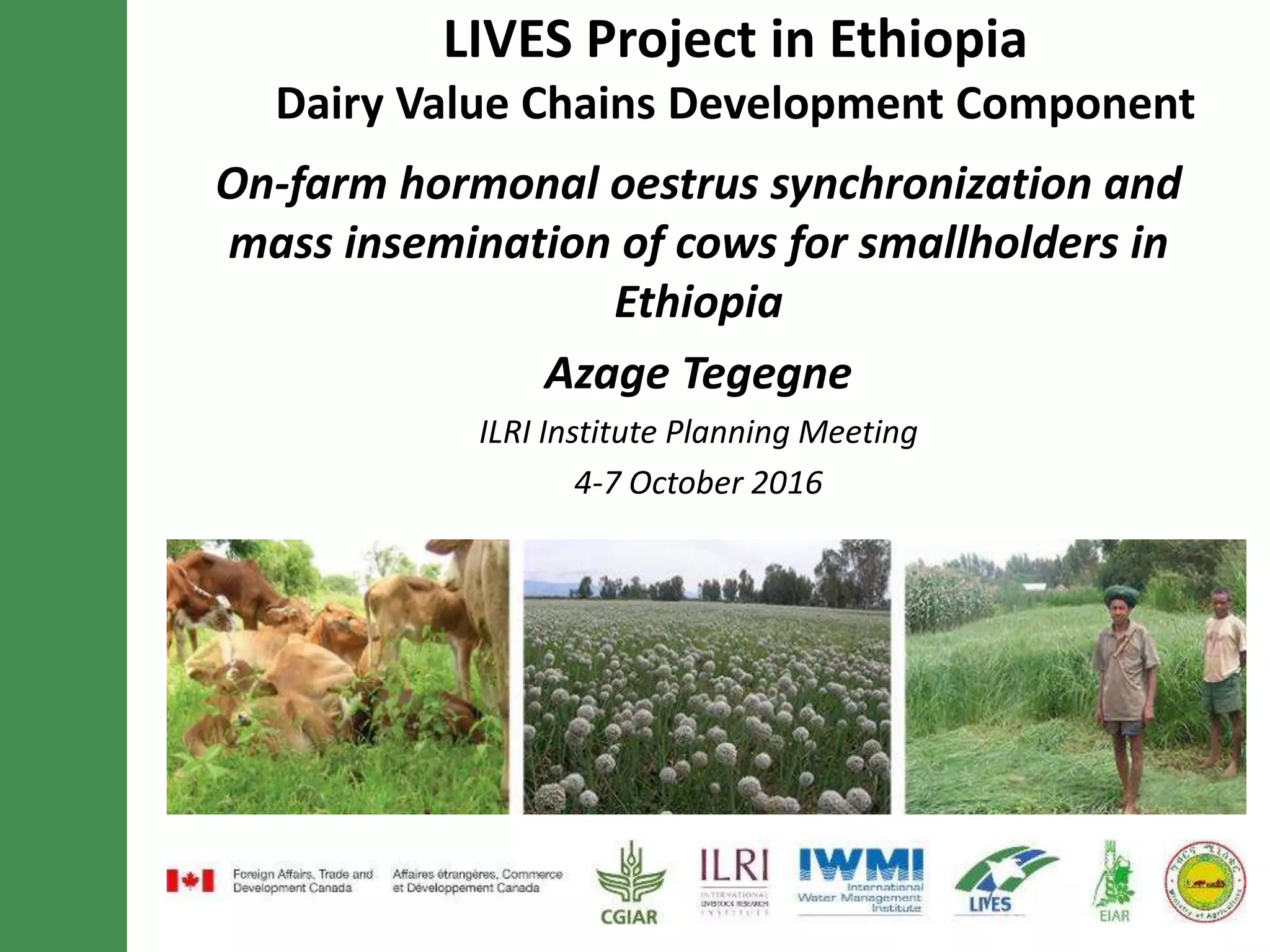 This document summarizes research on on-farm hormonal oestrus synchronization and mass artificial insemination of cows for smallholders in Ethiopia. It finds that while a researcher-led approach showed promise, scaling required institutional changes. Working with regional partners to train staff, over 600,000 cows were synchronized and inseminated from 2011-2015 across four regions. New technologies like progesterone tests helped with estrus detection and pregnancy diagnosis. The Ethiopian government's Livestock Master Plan now aims to increase crossbred cows to 5 million in 5 years to boost milk production and incomes.