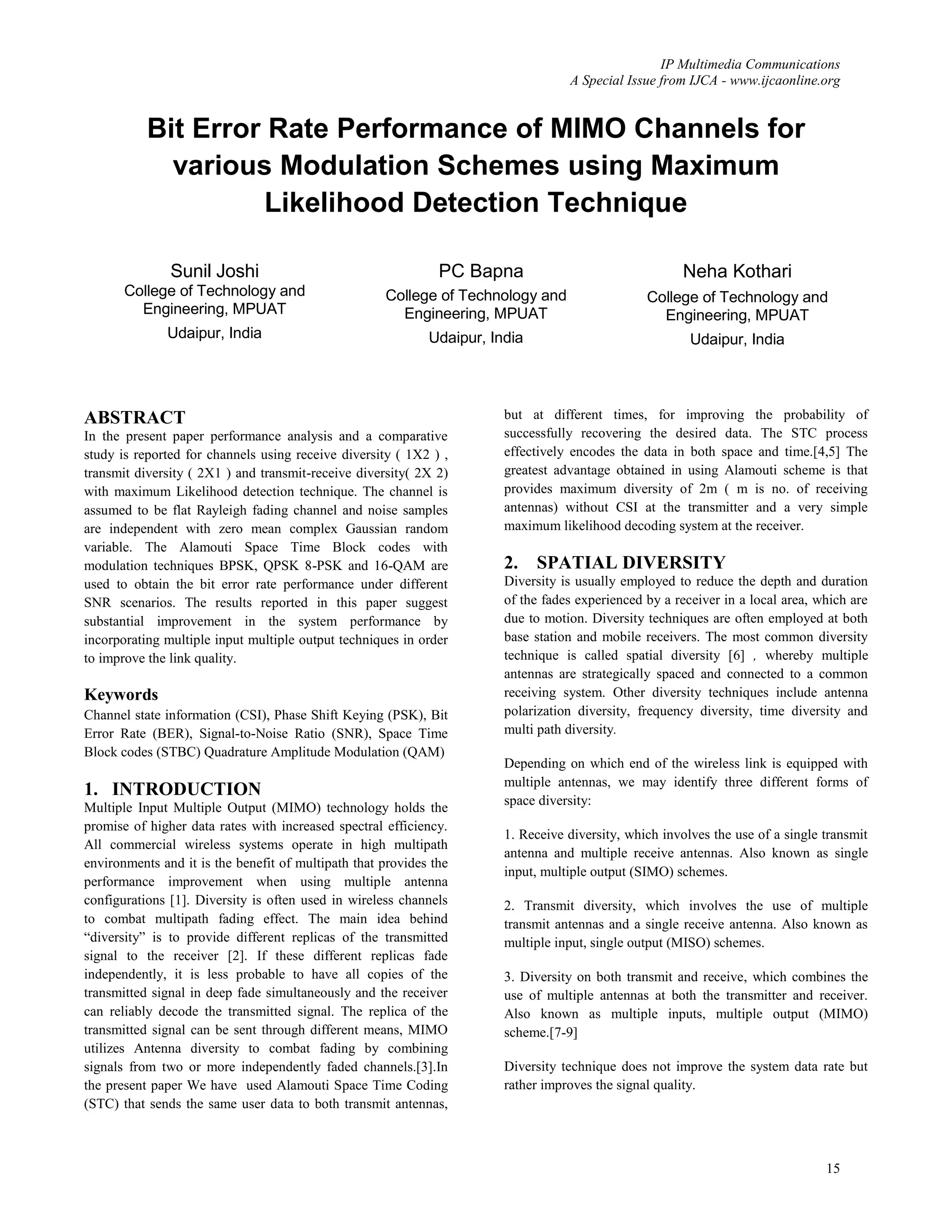 The document presents a performance analysis of MIMO (Multiple Input Multiple Output) channels utilizing Alamouti space-time block coding (STBC) for various modulation schemes. It discusses the benefits of using diverse receiving and transmitting antennas to improve bit error rate (BER) in flat Rayleigh fading channels, demonstrating significant performance gains. The conclusion emphasizes the effectiveness of the 2x2 Alamouti scheme in enhancing link quality without requiring bandwidth expansion.