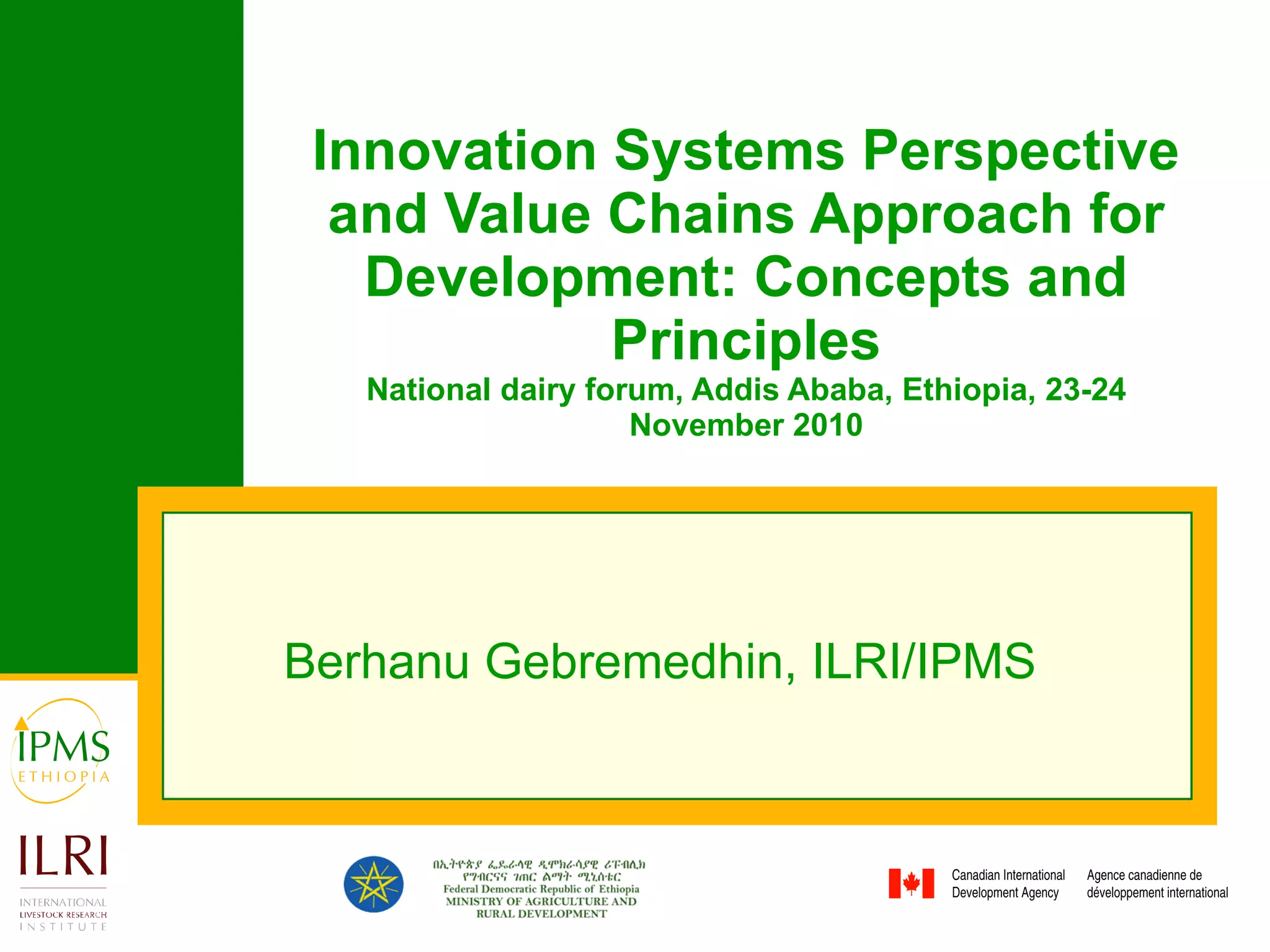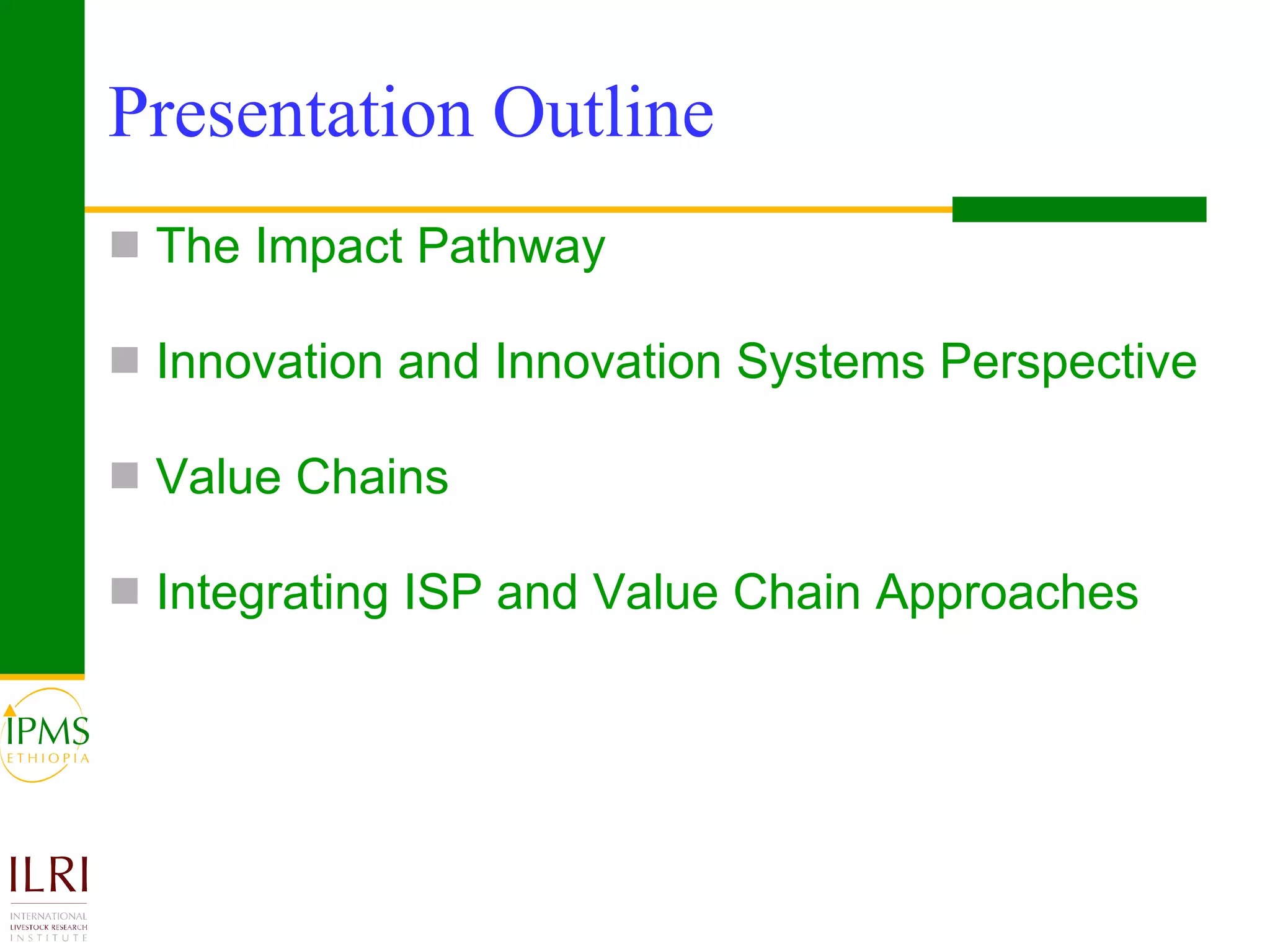 This document discusses integrating an innovation systems perspective and value chains approach for development. It defines key concepts like innovation systems, value chains, and the impact pathway. It argues that considering both innovation systems and value chains allows for a more comprehensive understanding of the actors, knowledge systems, and activities involved in commodity development. Looking at innovation possibilities across an entire value chain, from input supply to production to marketing, can help identify intervention points to enhance productivity, profitability and development outcomes.