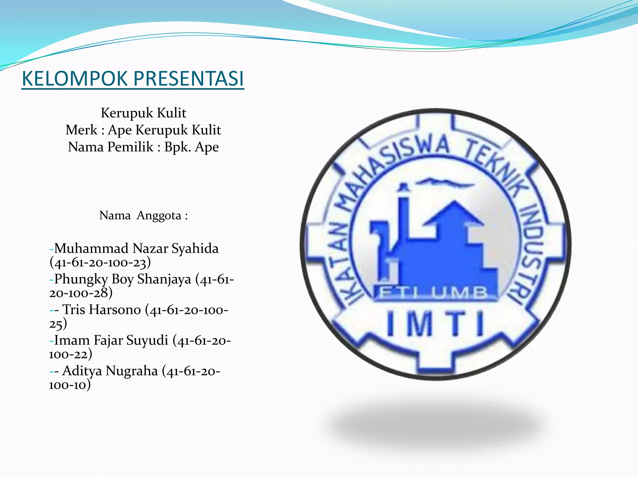 Dokumen ini memberikan informasi tentang kelompok presentasi tentang kerupuk kulit sapi. Terdapat daftar nama anggota kelompok, bahan bahan dan alat yang digunakan untuk membuat kerupuk kulit, proses pembuatannya mulai dari perontokan, pemisahan, perebusan hingga penggorengan, serta perkembangan penjualan produk kerupuk kulit.