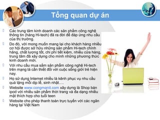 Dự án "shop ipod online" nhằm cung cấp các sản phẩm công nghệ hi-tech cho giới trẻ thông qua website www.congmanit.com, với nhiều phương thức thanh toán và chính sách quảng bá đa dạng. Mô hình marketing 4P được áp dụng để phân tích giá bán, quảng bá, nơi bán và sản phẩm. Dự án cũng chú trọng đến tối ưu hóa công cụ tìm kiếm (SEO) và các kênh truyền thông số khác để tăng doanh thu và nhận diện thương hiệu.