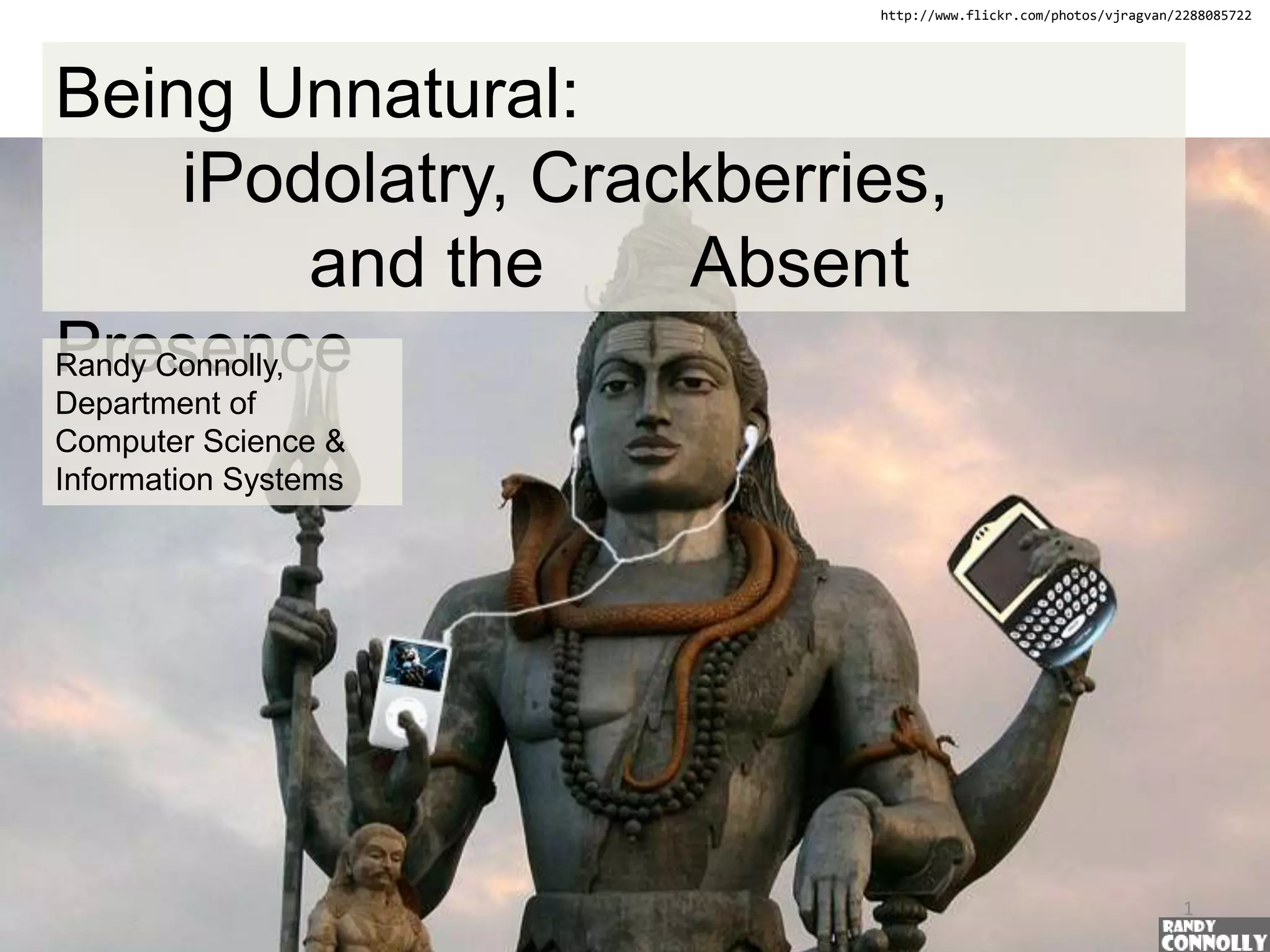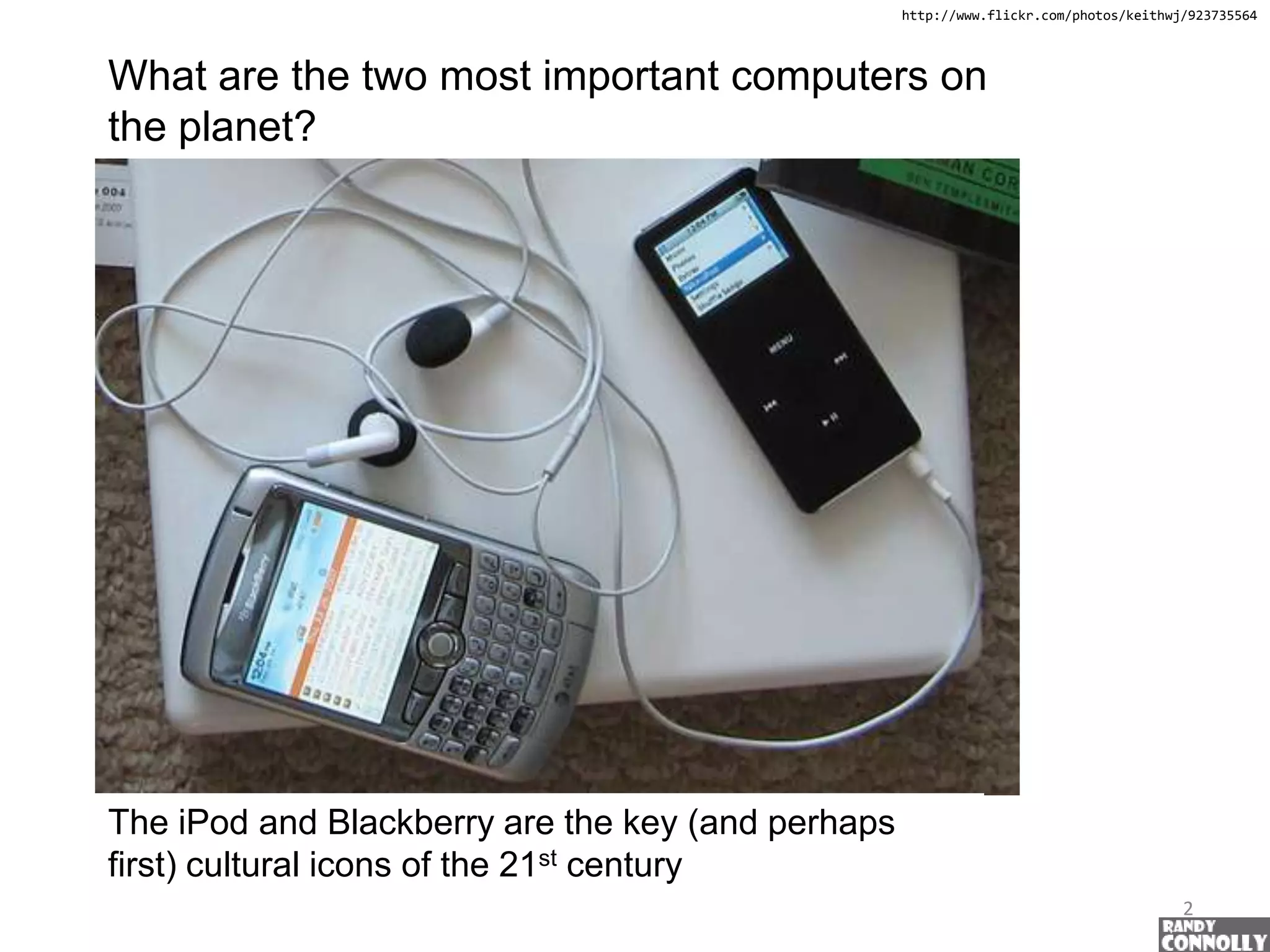 The document discusses the cultural significance and impact of devices like the Blackberry and iPod, labeling them as key icons of the 21st century that reflect the complexities of modern communication and personal engagement. While the Blackberry enhances productivity by enabling constant connectivity, it also risks creating compulsive behaviors and a chaotic work-life balance, as users find themselves accessible at all hours. The iPod, on the other hand, offers personal control and solitude in an increasingly impersonal urban environment, but may contribute to a detachment from public spaces and social connections.